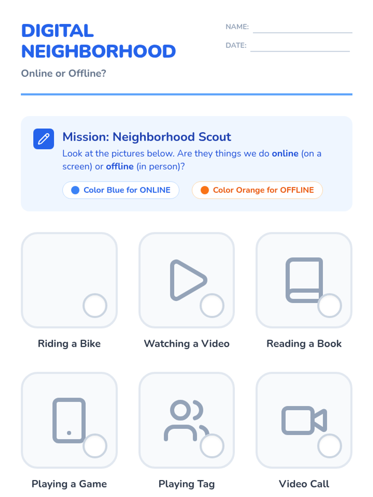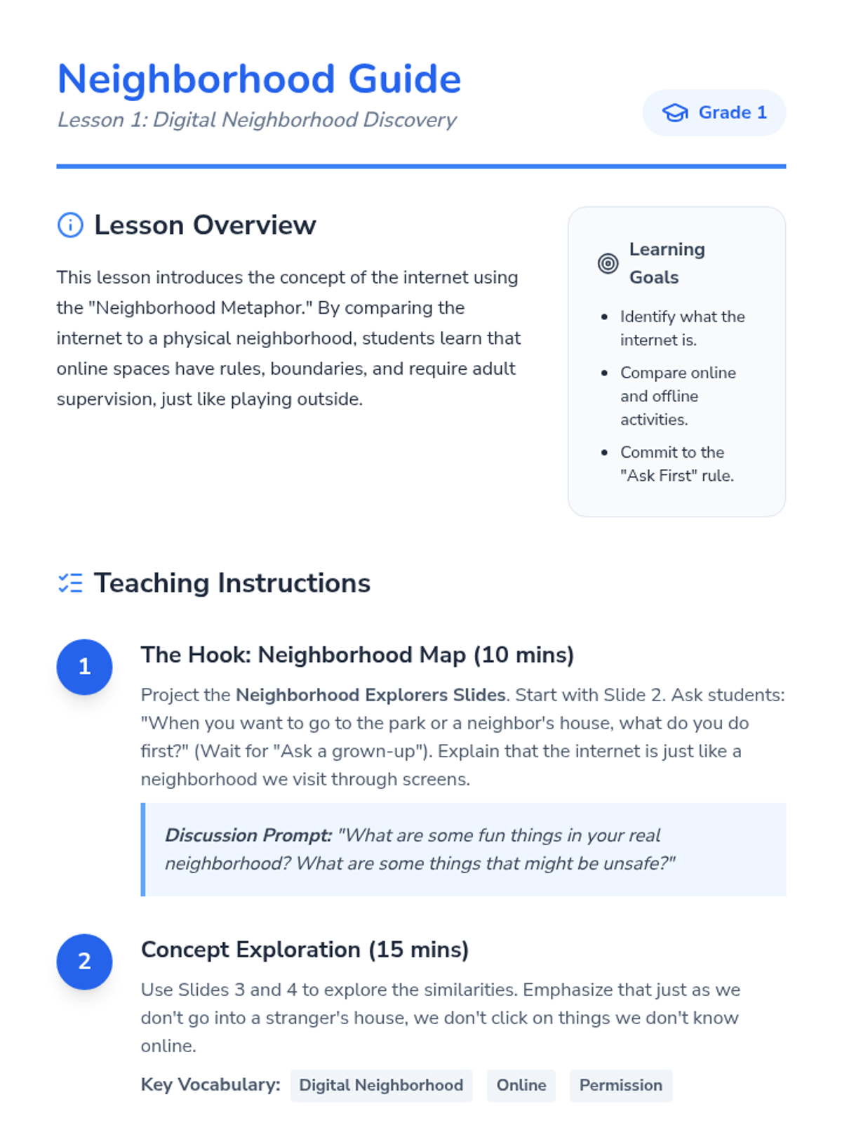 A comprehensive 5-lesson sequence for 1st graders to understand internet safety as a 'Digital Neighborhood'. Students learn to ask for permission, use the 'Pause and Think' strategy, balance screen time, and create a family safety agreement.