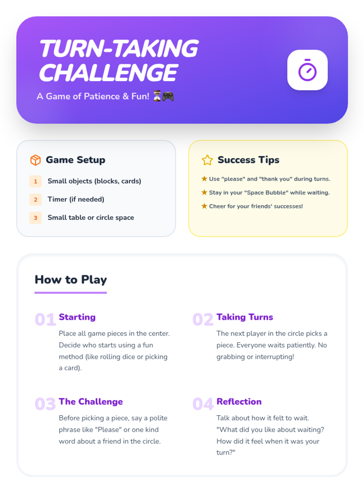 A 5-session individual intervention designed for students to develop self-regulation, distinguish between tattling and reporting, and respect peer boundaries. Students learn to 'mind their own business' through interactive stories, role-plays, and self-regulation tools.