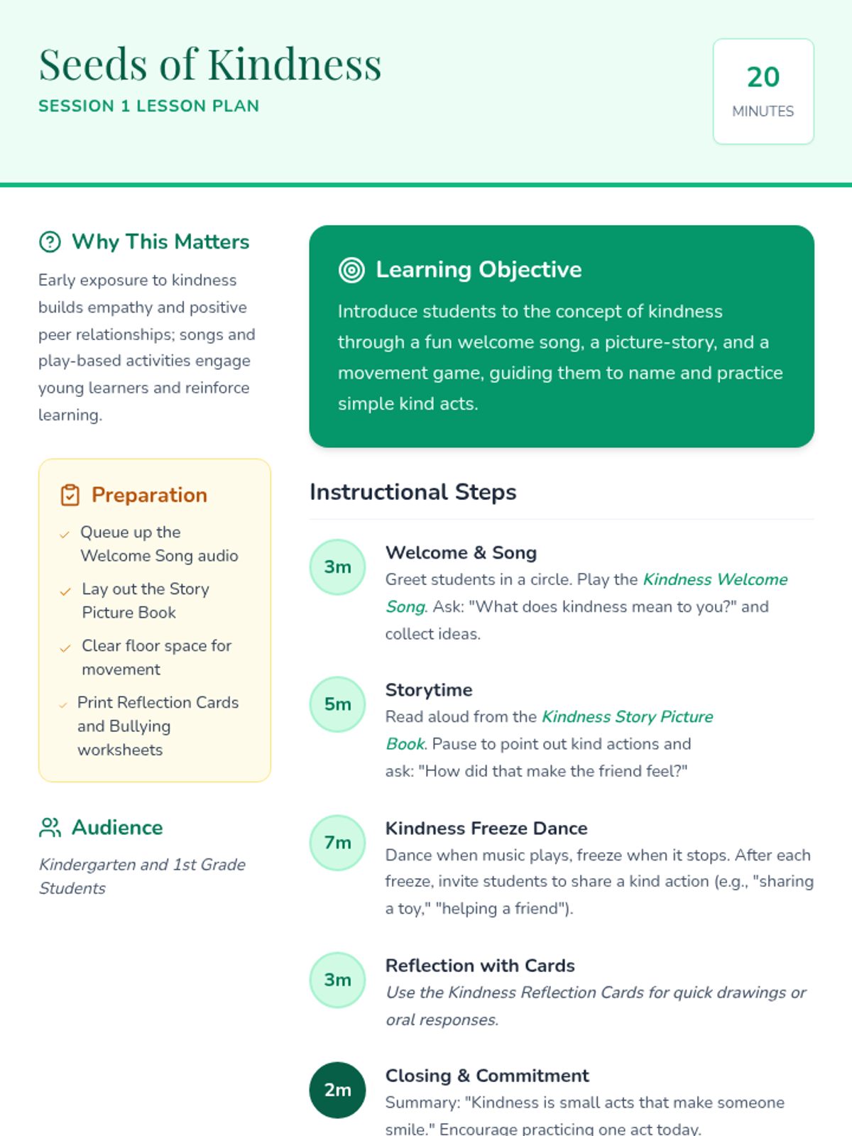 A 5-day series of quick, 5-minute morning lessons for grades 1-3 focusing on positive values like unity, kindness, empathy, respect, and anti-bullying. Each day starts the classroom journey with heart and purpose.