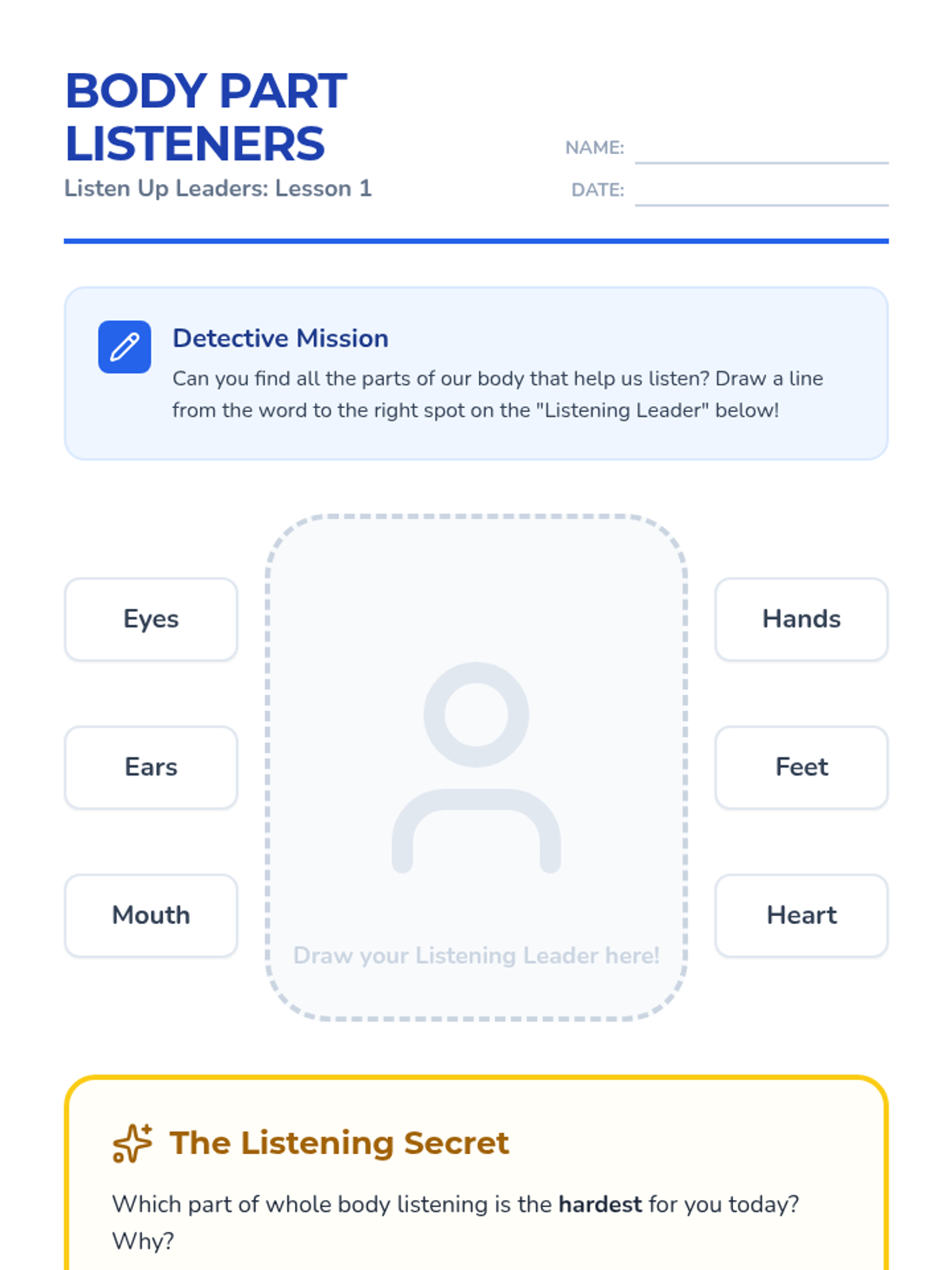 This sequence introduces first-grade students to the fundamental concepts of active listening, moving beyond just hearing words to understanding 'whole body listening.' Students explore how eye contact, body language, and non-verbal cues show respect and attention in a group setting.