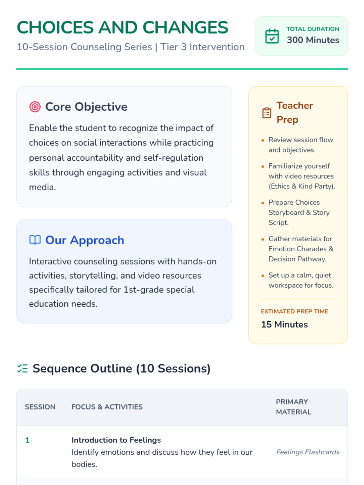 A 10-session counseling sequence for a 1st grade special education student focusing on personal accountability, self-regulation, and the social impact of choices.