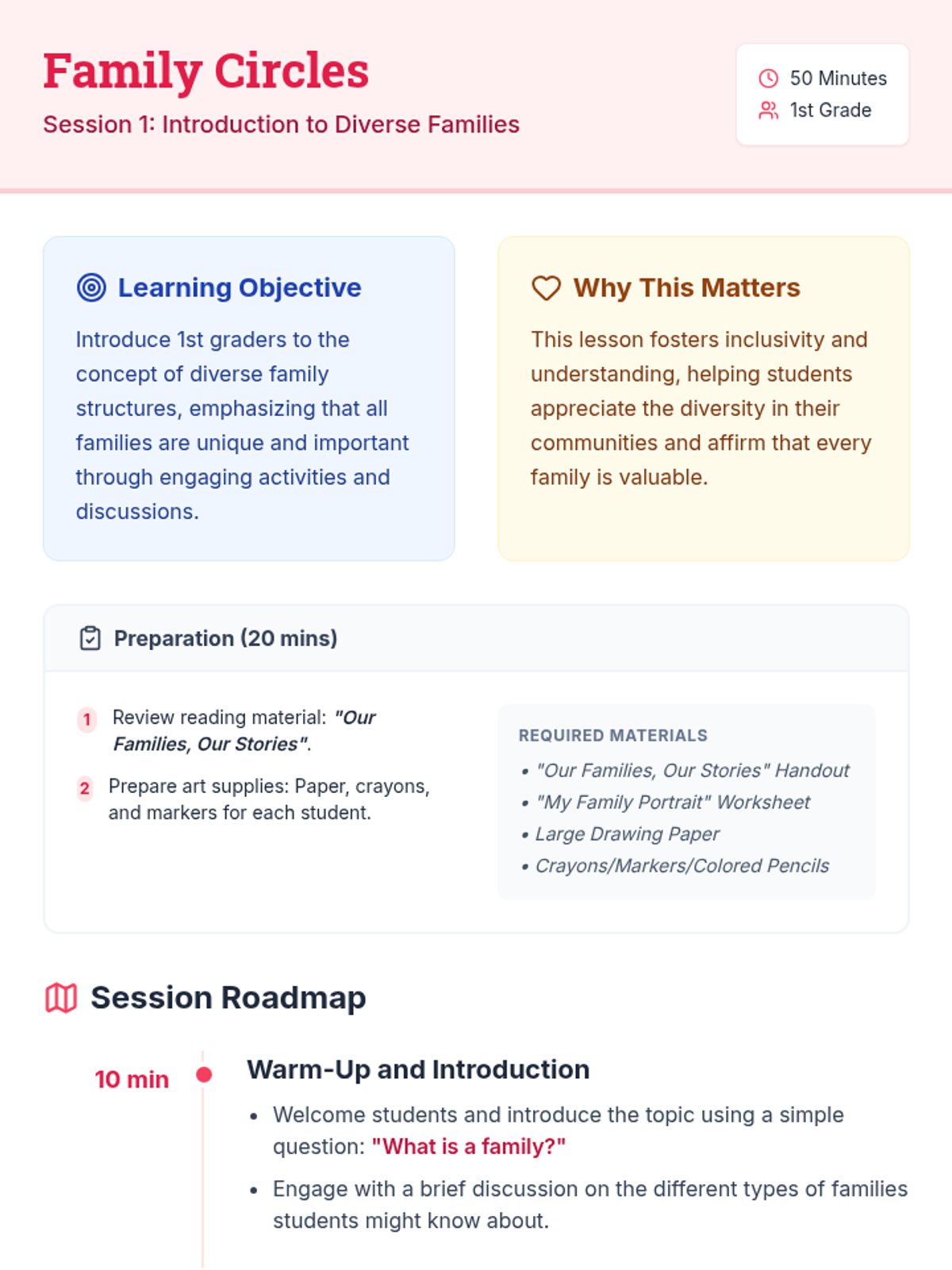 A three-session sequence for 1st graders focused on exploring and celebrating diverse family structures through stories, role-play, and collaborative art. Students learn that while every family is unique, they are all built on foundations of love and care.