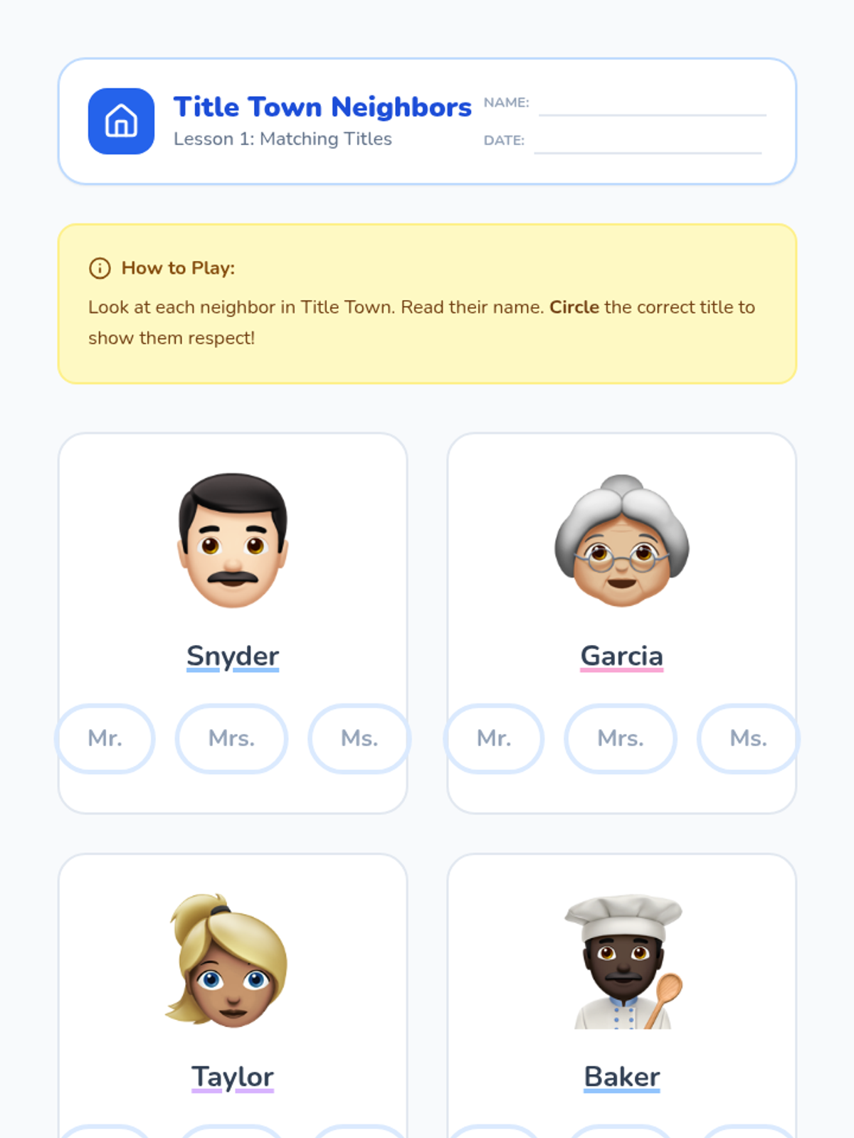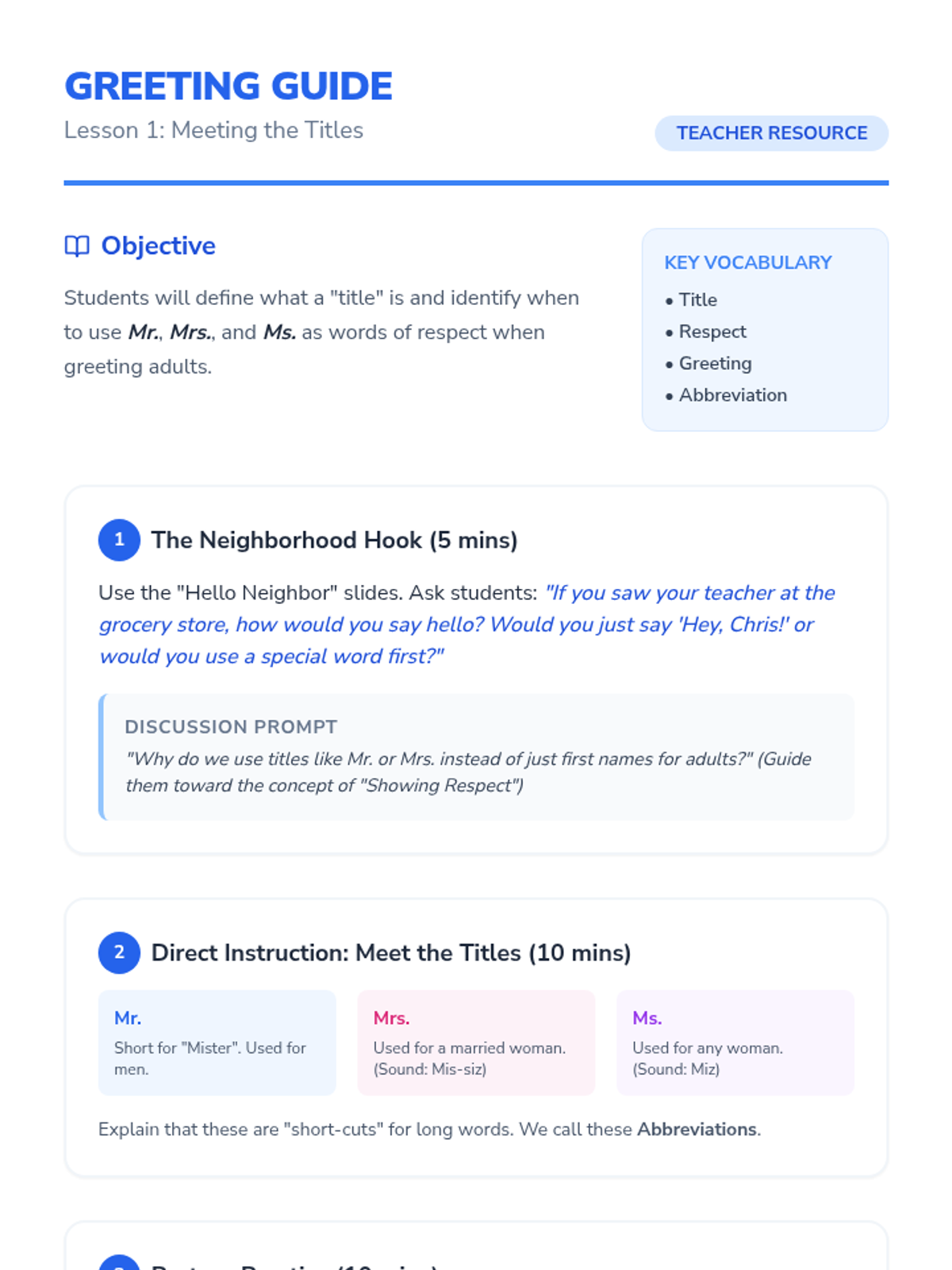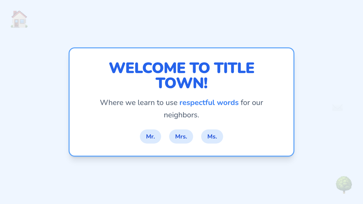 A 1st Grade ELA sequence introducing personal titles (Mr., Mrs., Ms., Dr.) and the mechanics of abbreviations through a friendly neighborhood theme. Students learn to recognize, punctuate, and apply titles of respect in their writing.