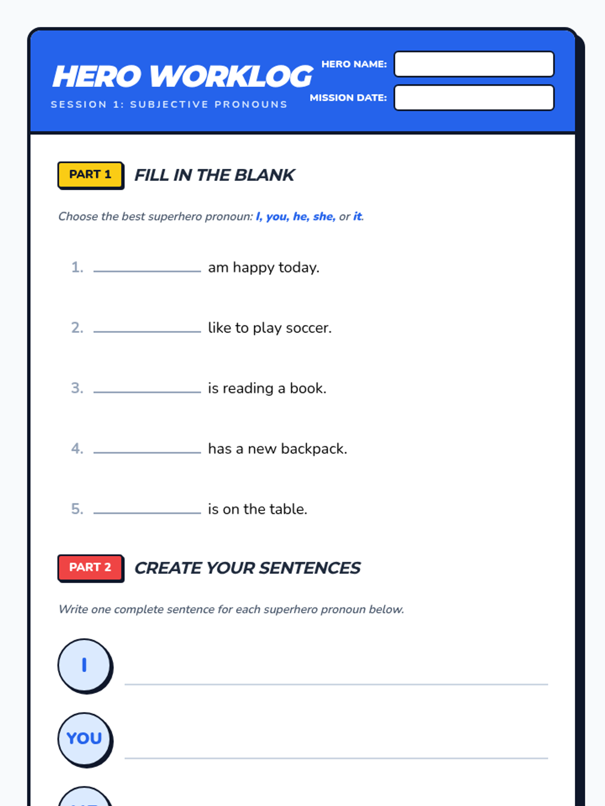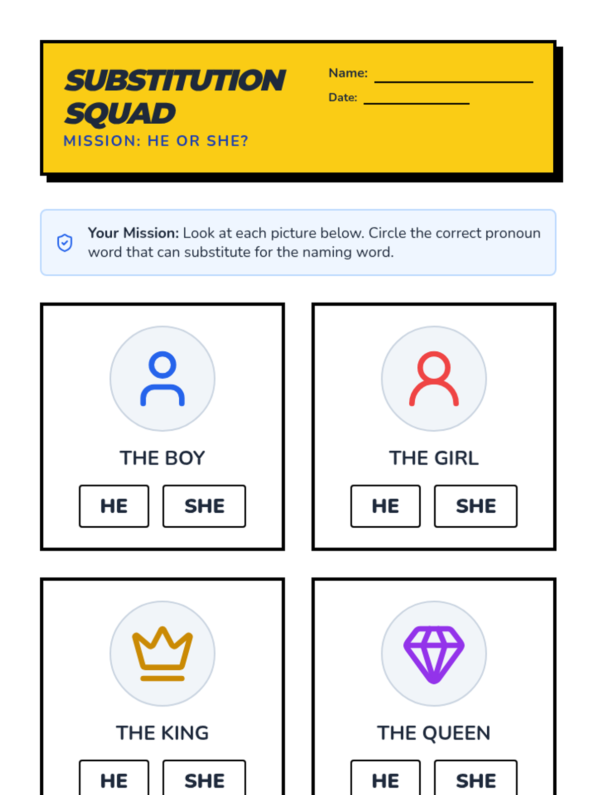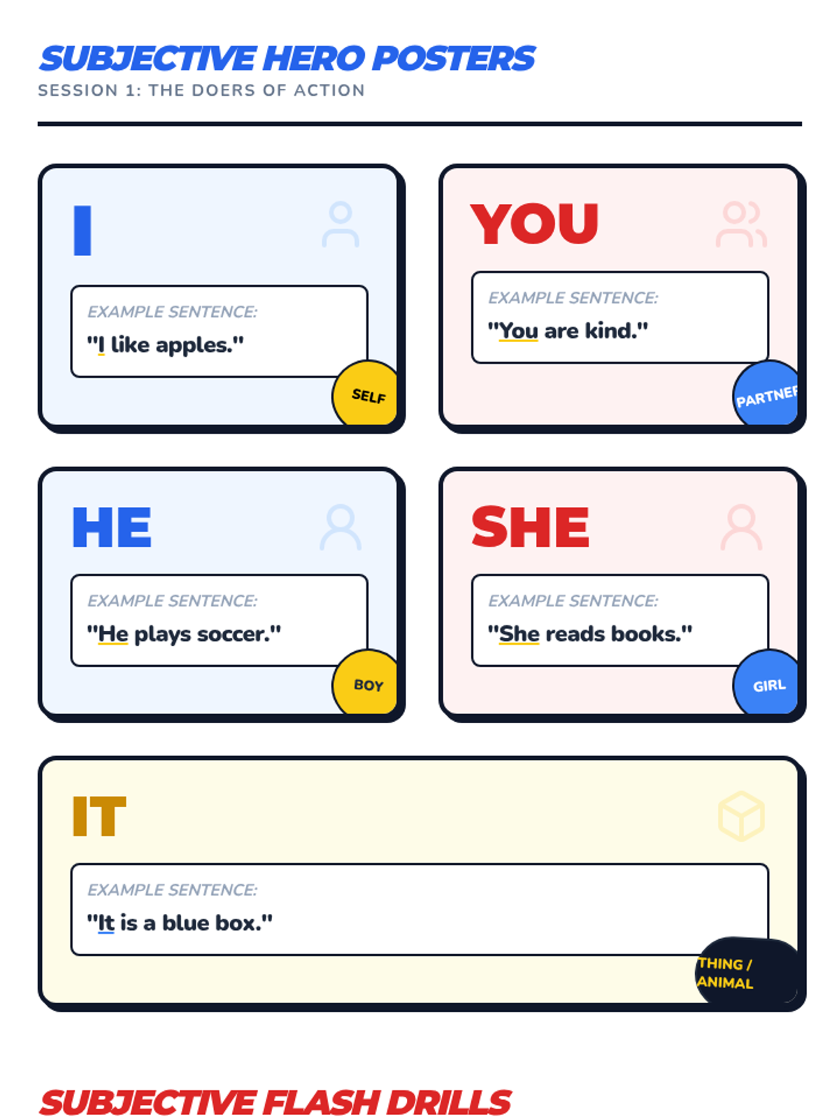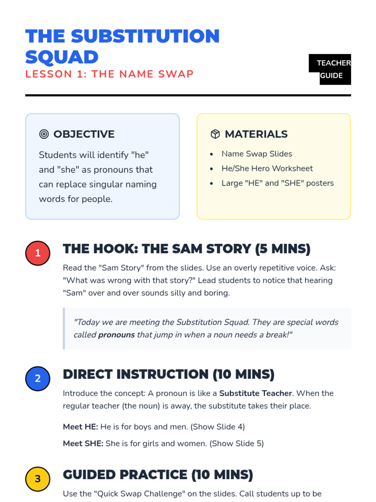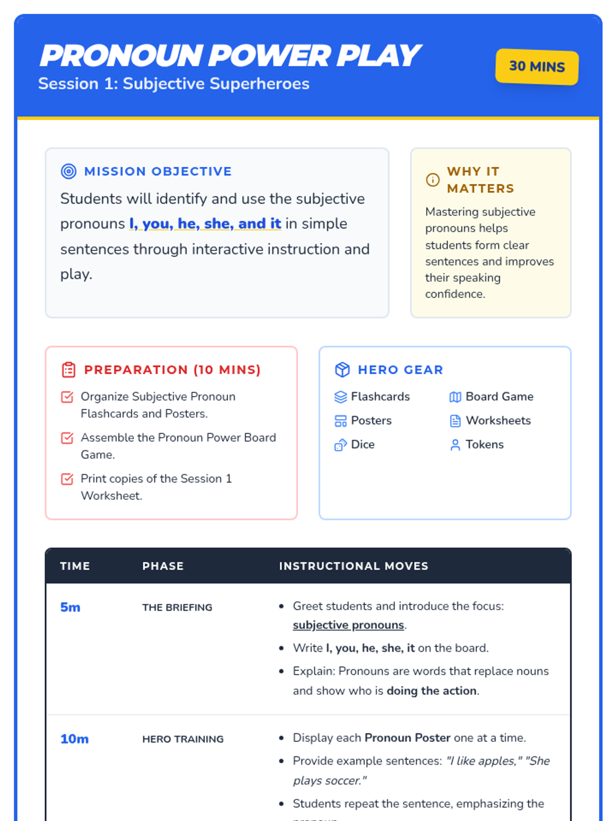 A 1st Grade ELA sequence focused on identifying and using subject pronouns (he, she, it, we, they) to replace nouns. Through a superhero-themed 'Substitution Squad' approach, students move from oral recognition to written application.