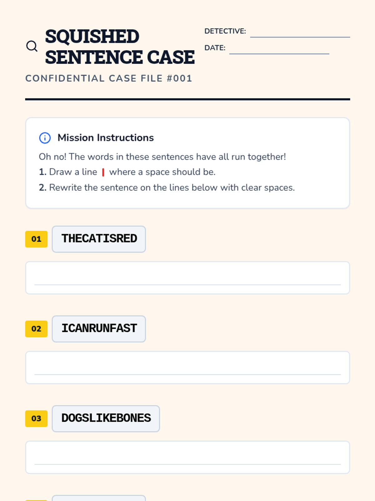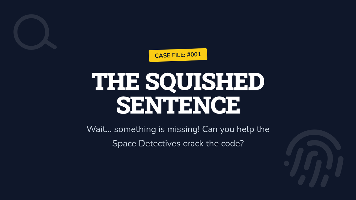 A game-based detective sequence for 1st graders focusing on word spacing, margin awareness, and overall text legibility. Students use 'Spaceman' tools and detective skills to decode squished text and produce clear, readable writing.