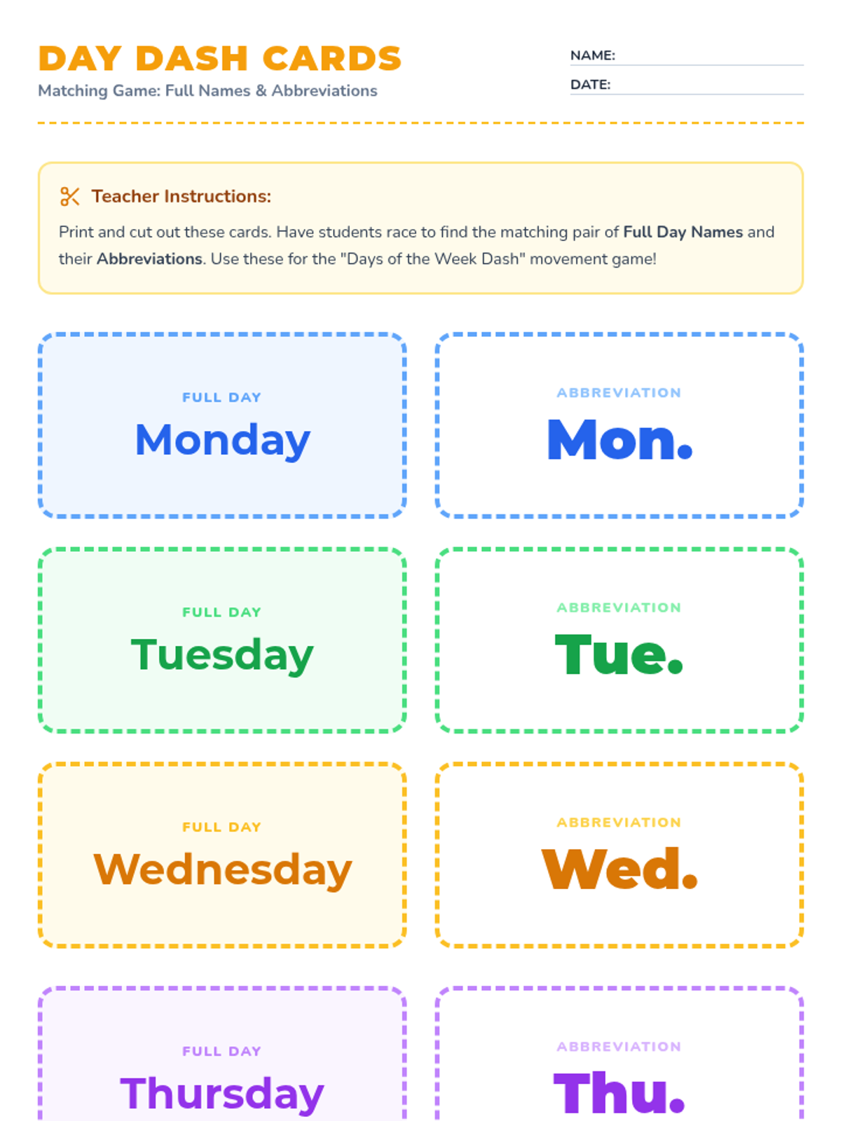 A 1st-grade grammar sequence focused on mastering abbreviations for days of the week and months of the year through games, movement, and real-world application.