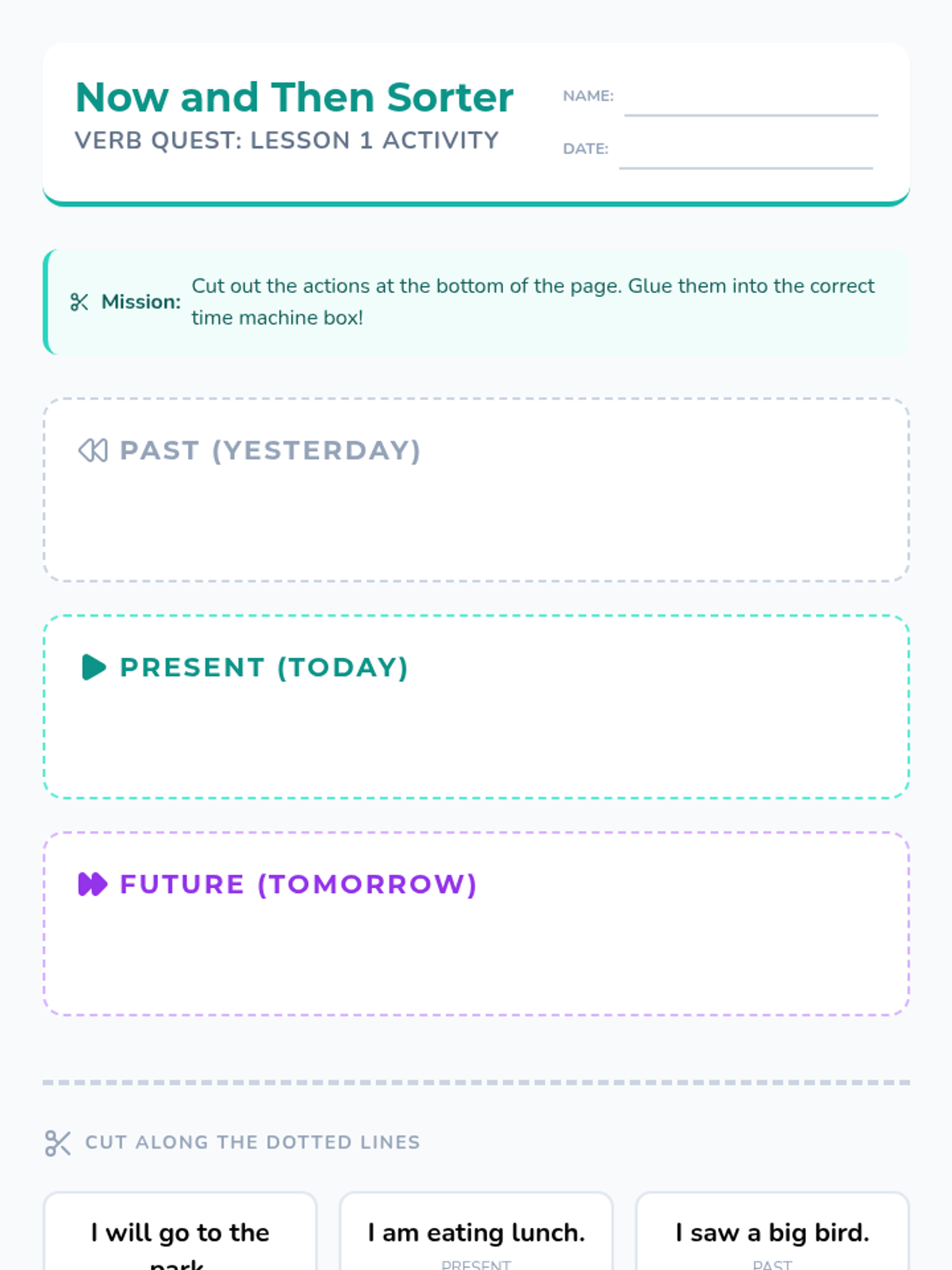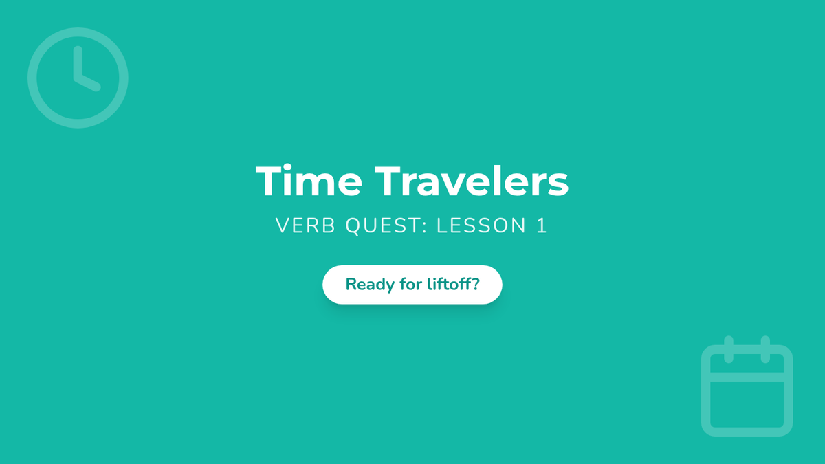 A comprehensive 1st-grade unit on verb tenses (past, present, and future). Students explore the concept of time through language, mastering the '-ed' suffix, the helping verb 'will', and common irregular past-tense verbs through interactive games and storytelling.