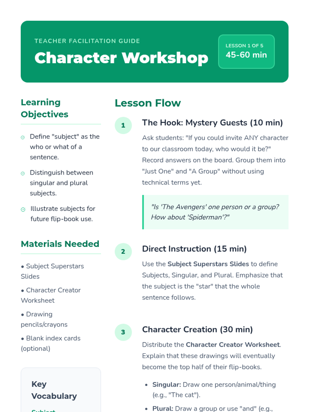 A workshop-style sequence for 1st graders focusing on subject-verb agreement through drafting, expansion, and editing. Students learn to match verbs with singular, plural, compound, and collective subjects.