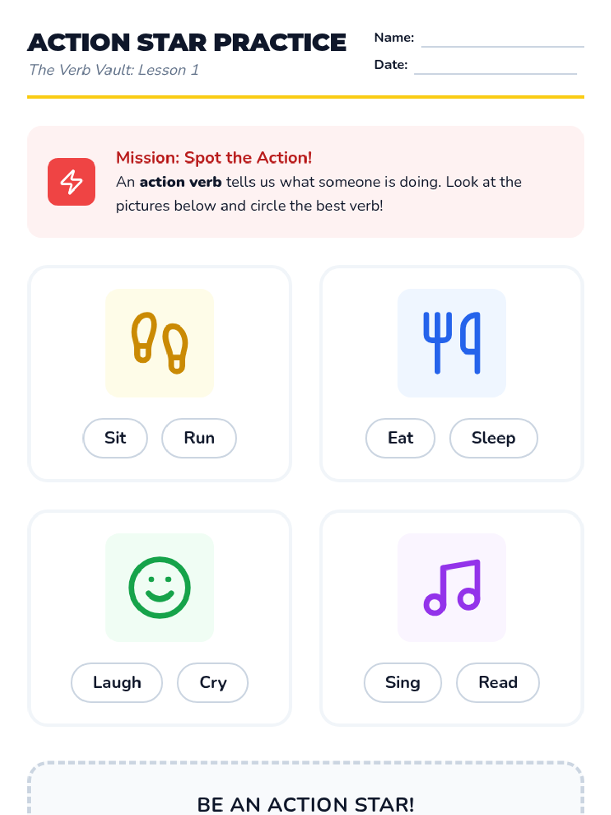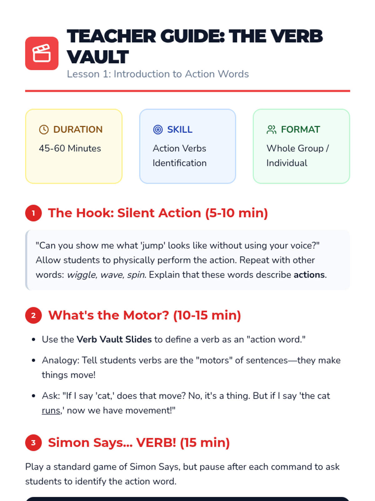A 1st Grade sequence focused on identifying and using action verbs through physical movement, sorting activities, and creative writing. Students progress from acting out verbs to selecting precise words to energize their own stories.