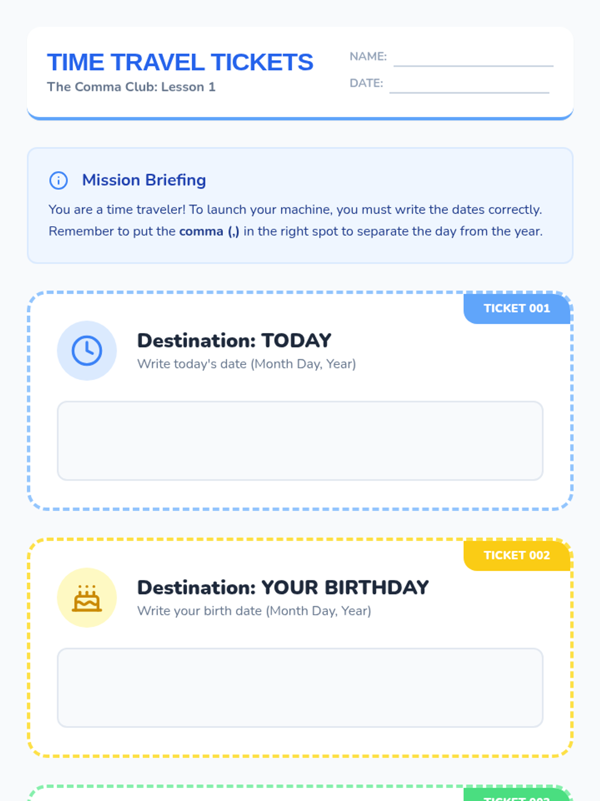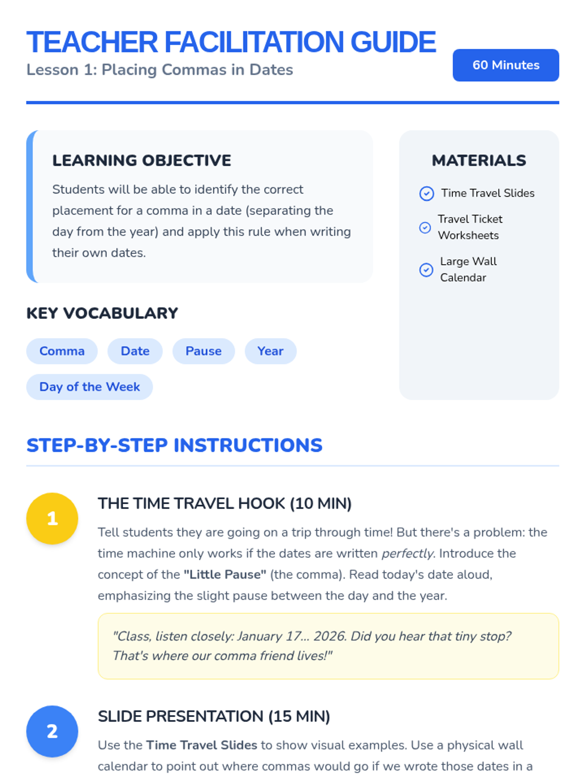 A 1st Grade sequence focused on using commas to separate days from years in dates and items in a series of three or more. Students use a writer's workshop model to observe, practice, and apply comma rules in functional and creative writing tasks.