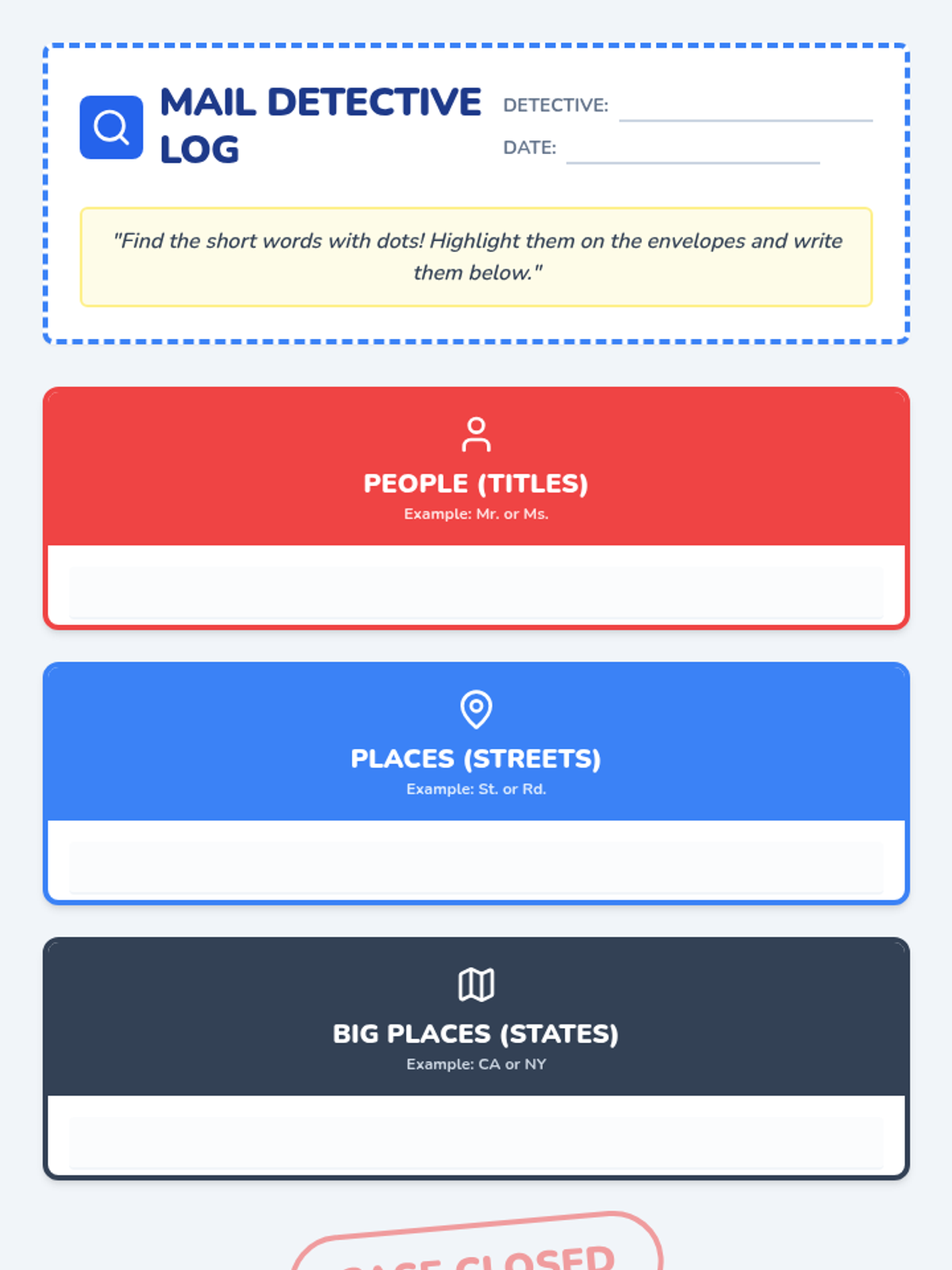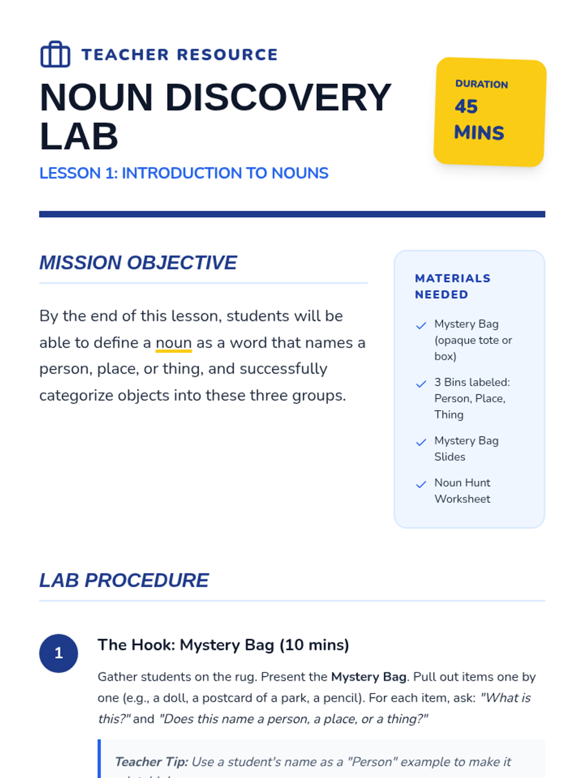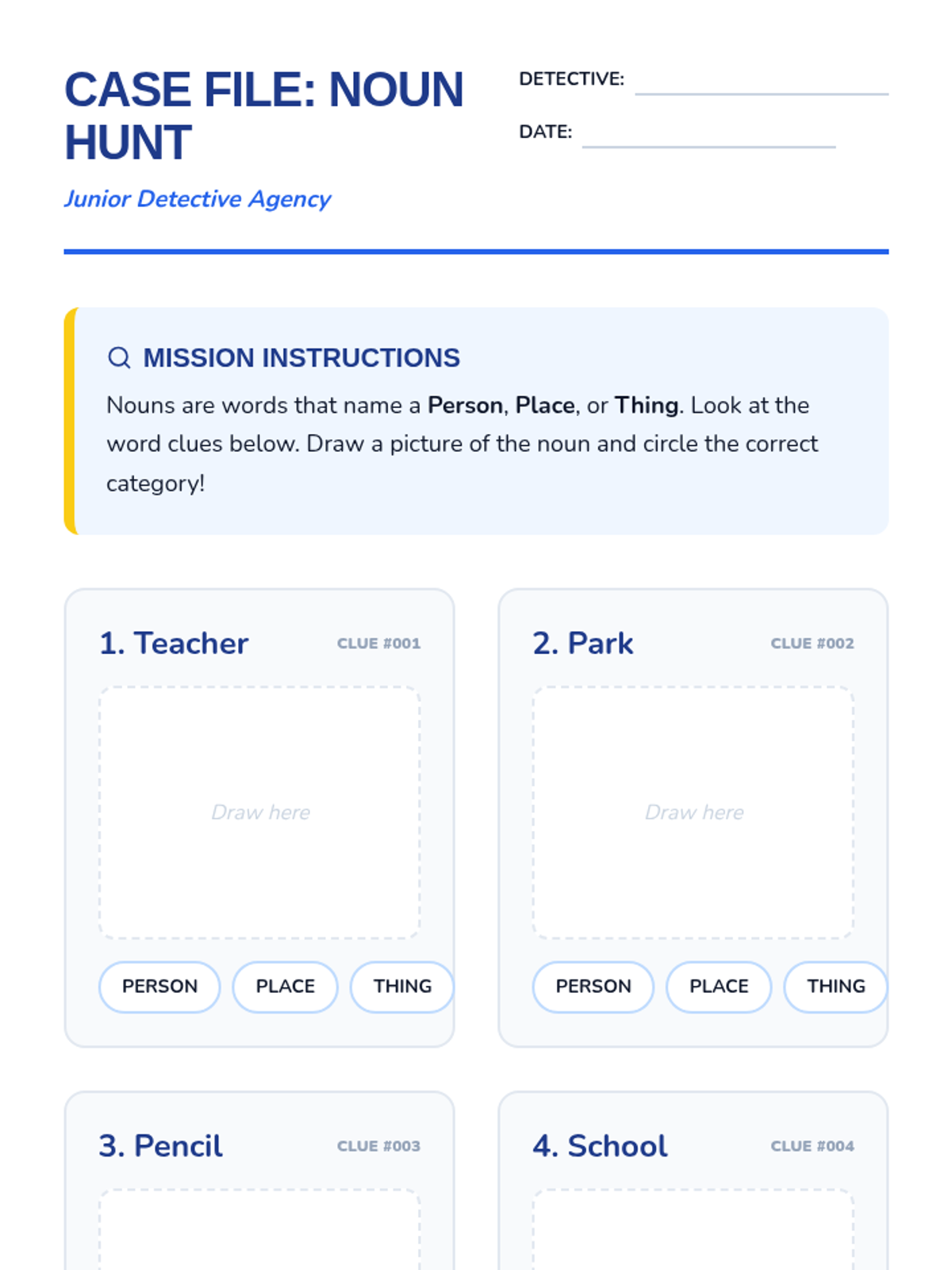 A foundational grammar sequence for first graders exploring nouns and adjectives through a 'Junior Detective' lens. Students progress from identifying naming words to using sensory details to write descriptive sentences.