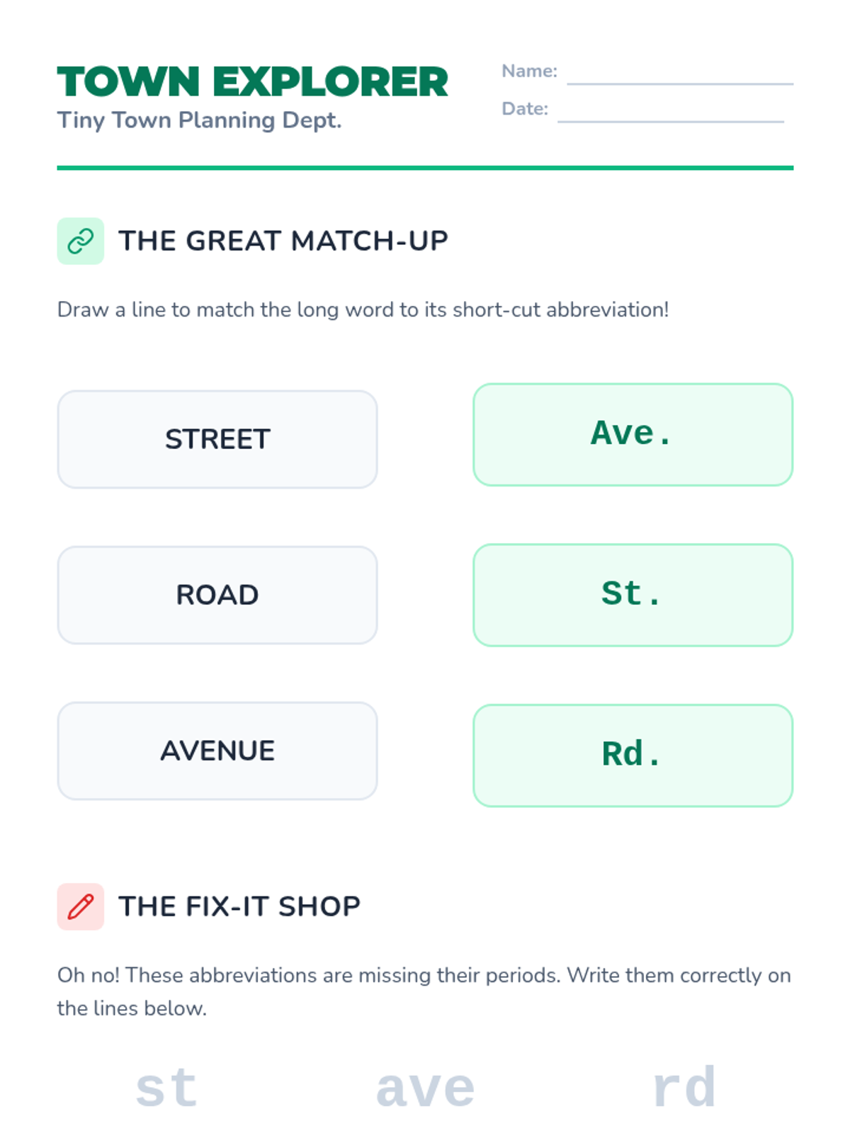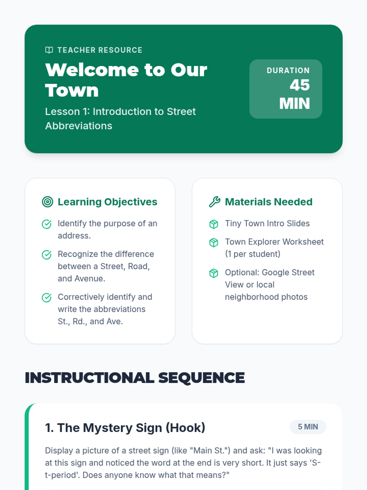 A project-based unit where 1st-grade students become town planners to learn street abbreviations (St., Rd., Ave., Blvd.). Through designing maps, signs, and envelopes, students apply grammar rules to real-world navigation and communication.