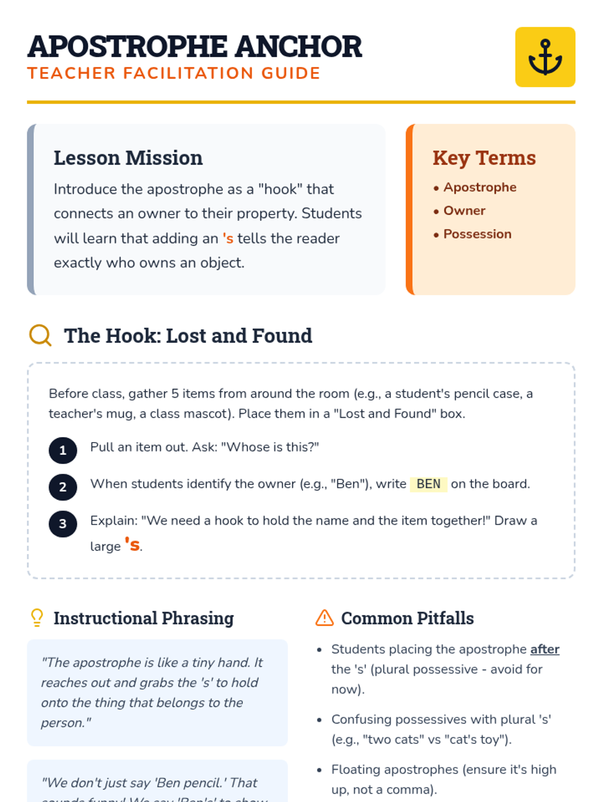 A comprehensive 1st Grade sequence introducing possessive apostrophes and quotation marks through concrete visuals and hands-on construction themes. Students learn to show 'who owns it' and 'who said it' using 'Punctuation Builder' motifs.