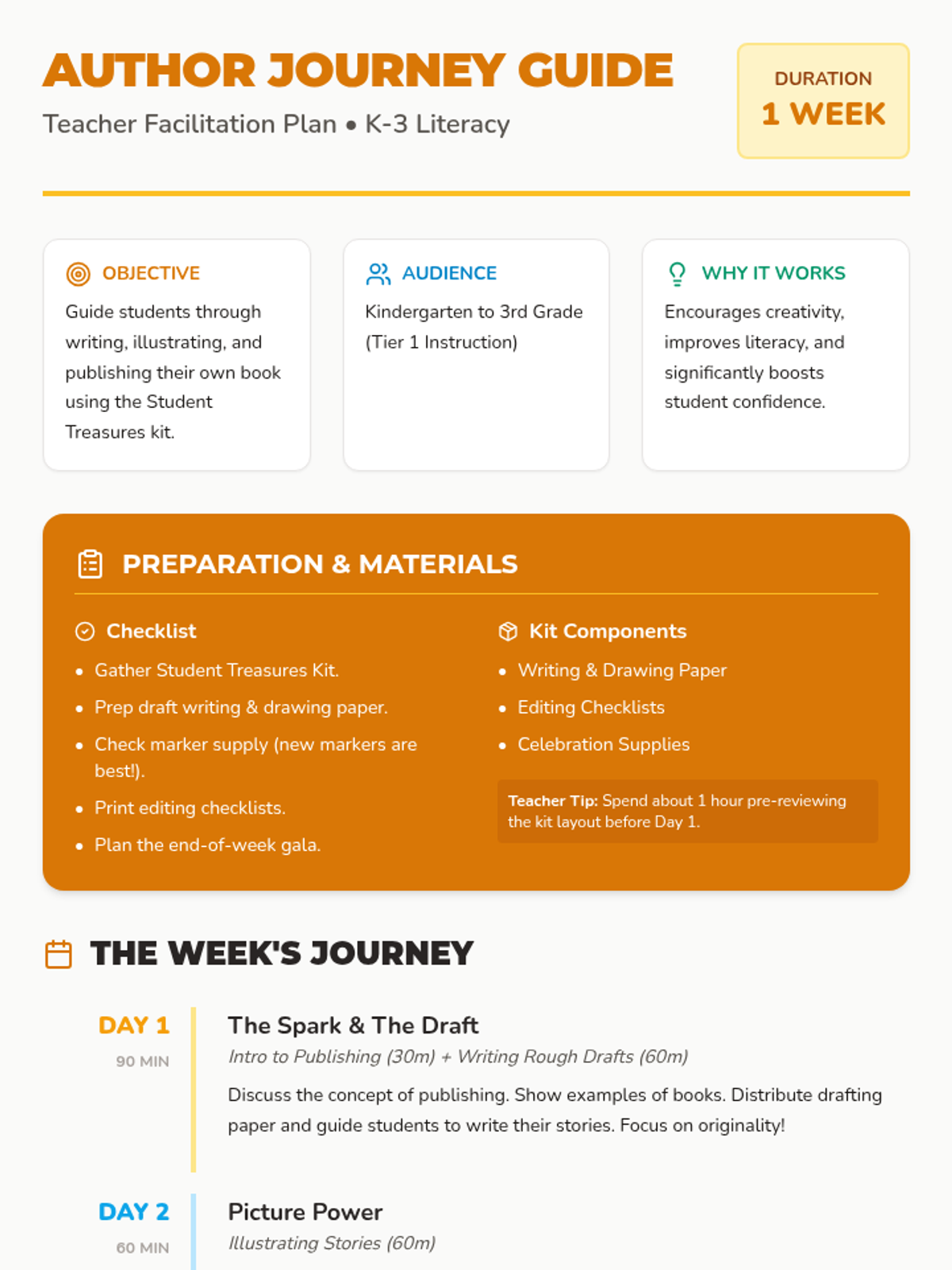A comprehensive week-long project where K-3 students write, illustrate, and publish their own books using the Student Treasures kit.