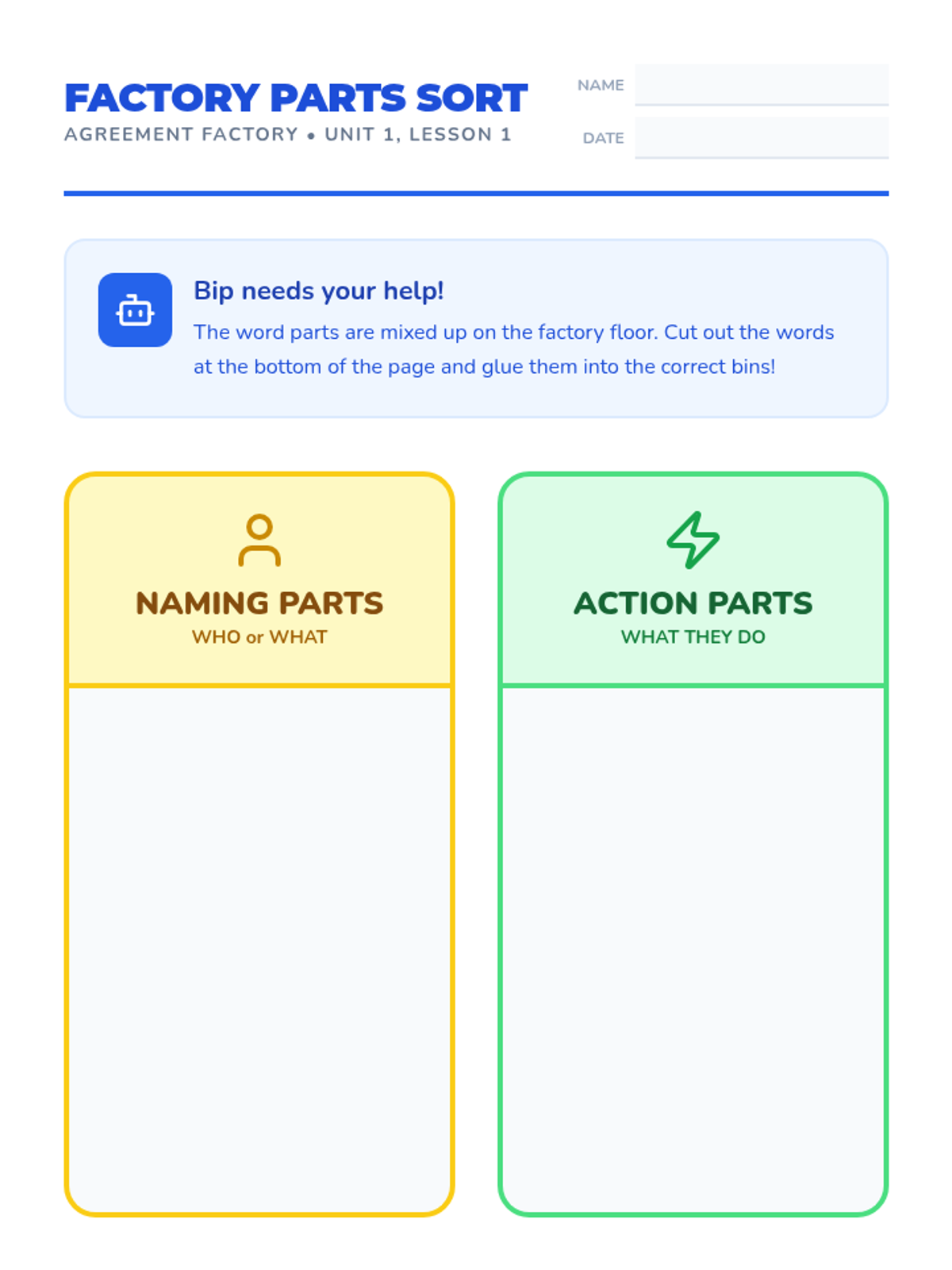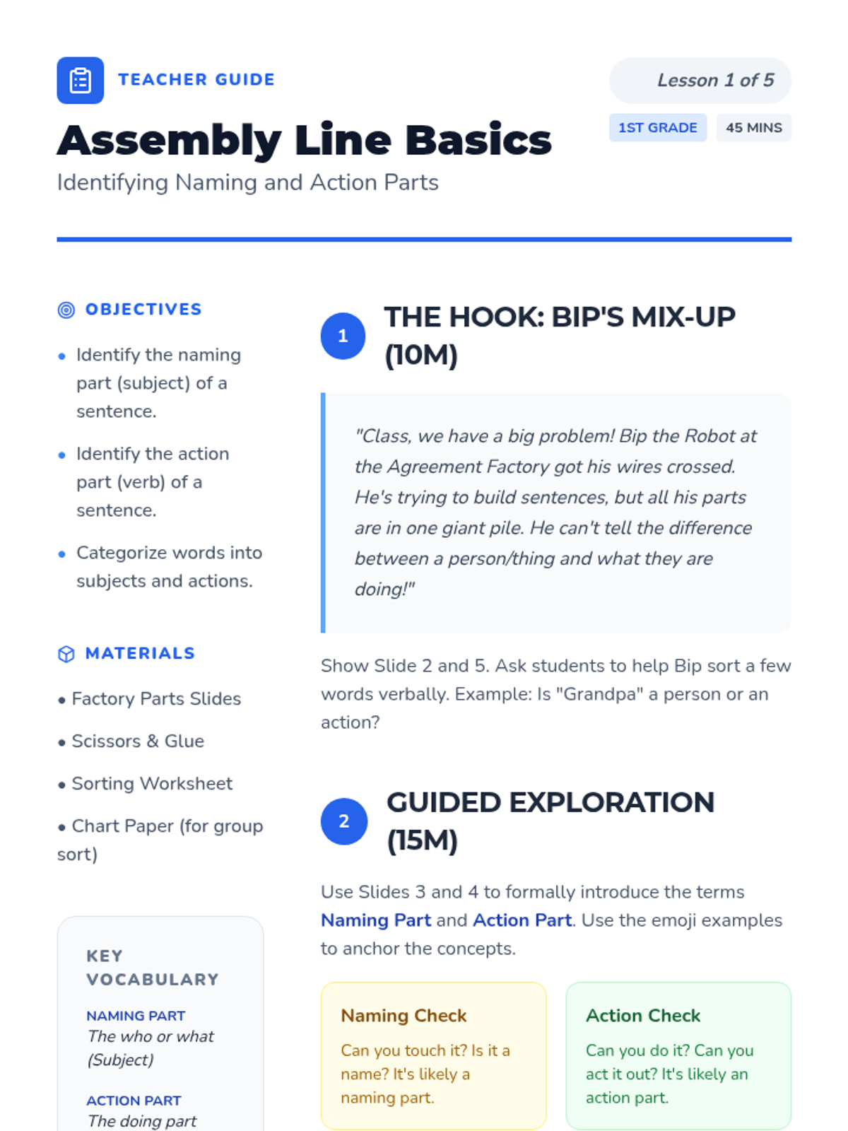 A foundational grammar sequence for first graders focused on subject-verb agreement. Students learn to identify naming and action parts and apply the 's' rules for singular, plural, and compound subjects through the 'Agreement Factory' theme.