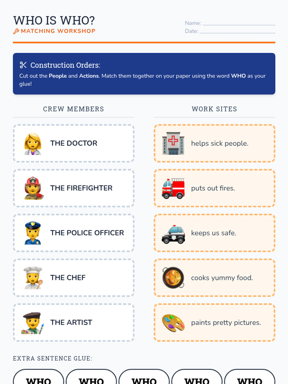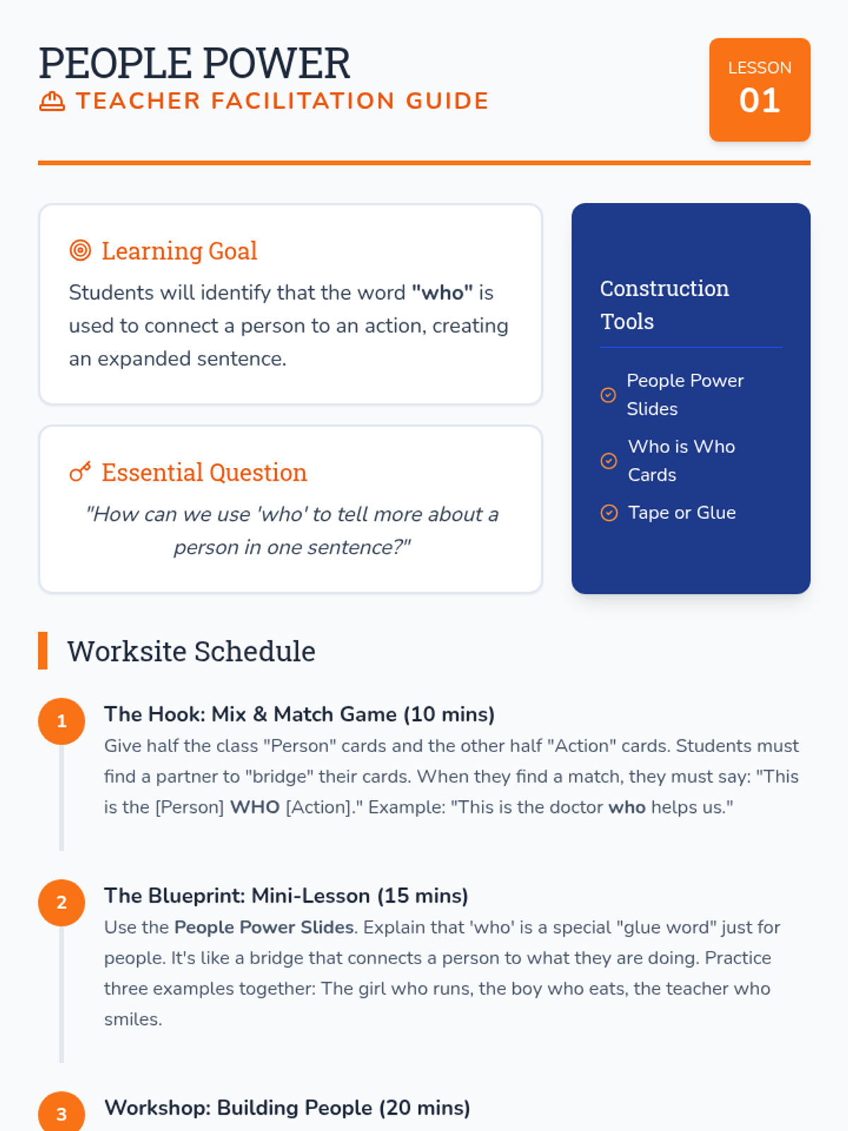 A 1st Grade ELA sequence focused on relative pronouns 'who' and 'that' as 'sentence glue'. Students progress from identifying which connector to use to building complex, descriptive sentences through hands-on construction-themed activities.