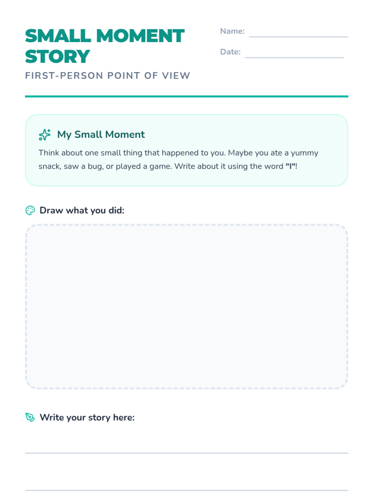 A project-based 1st-grade sequence connecting point of view with narrative writing. Students master first and third-person perspectives by drafting personal stories and observational reports, culminating in a class anthology and showcase.