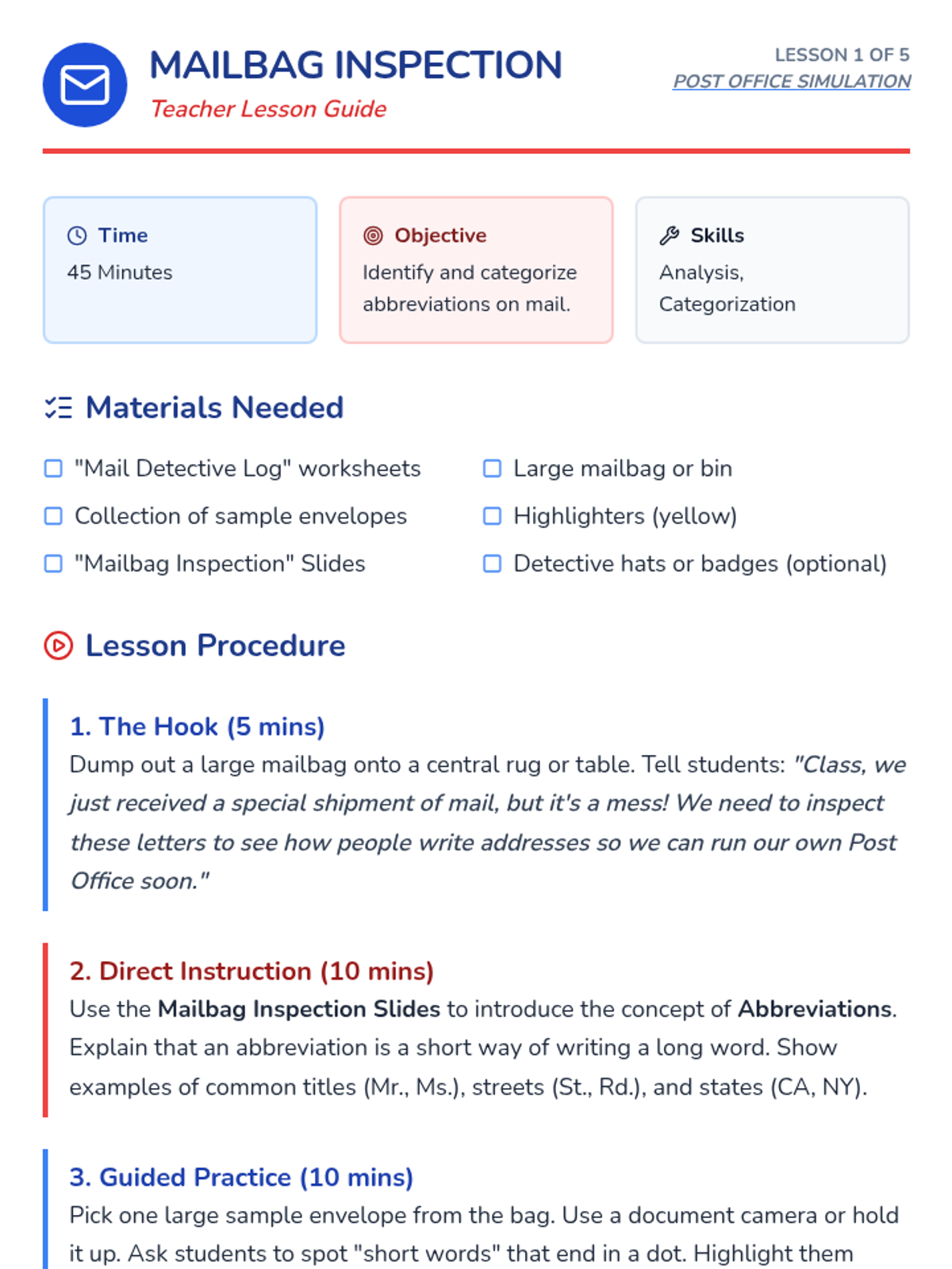 A 1st-grade ELA sequence where students run a classroom post office to master abbreviations for titles, dates, and addresses. Through hands-on simulation, students learn the practical necessity of standard abbreviations for clear communication.