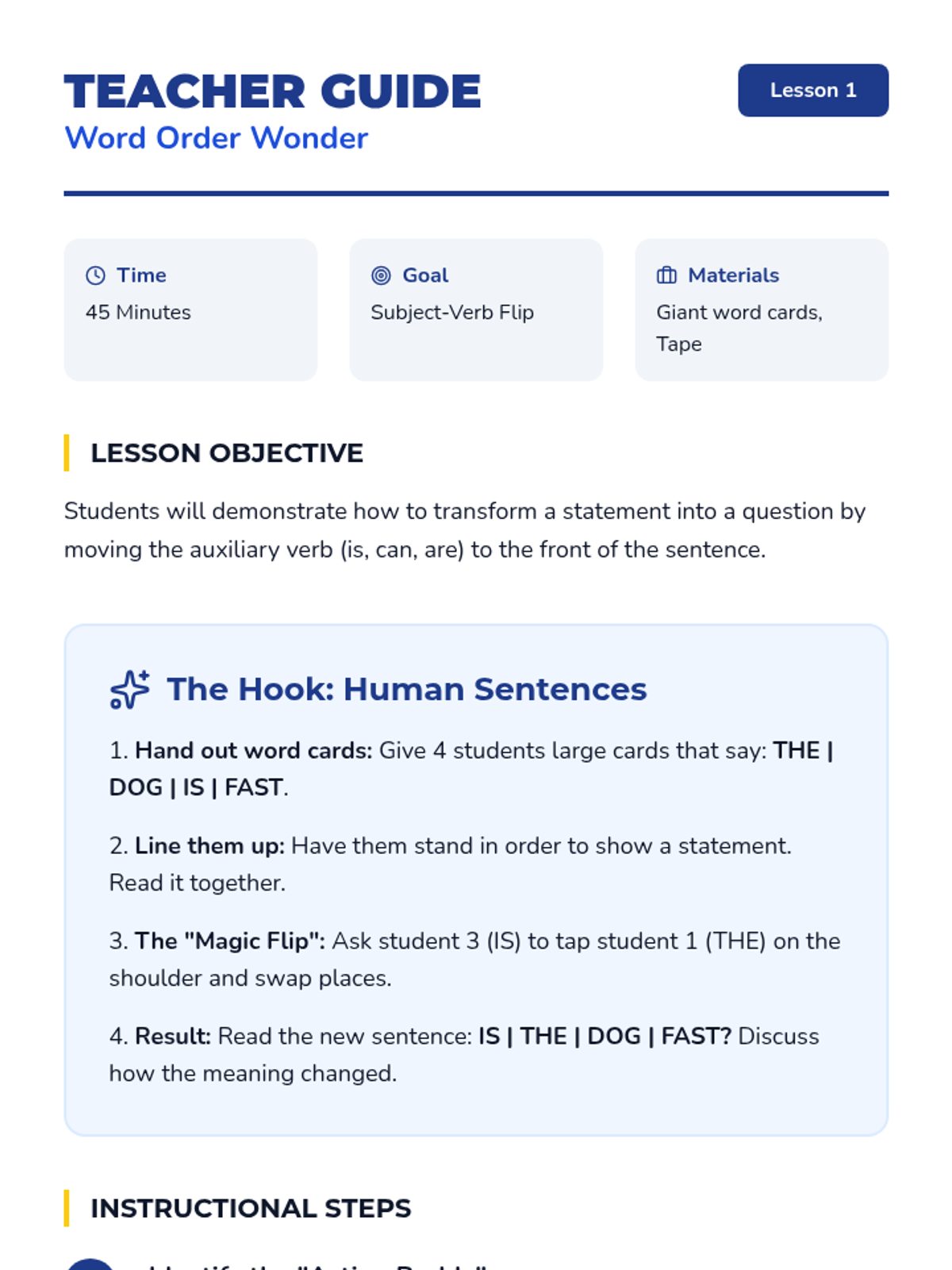 This sequence introduces 1st Grade students to the imperative mood through the concept of 'Bossy Verbs.' Students will move from identifying commands in speech to writing their own multi-step 'How-To' guides, focusing on clarity, punctuation, and sequencing.