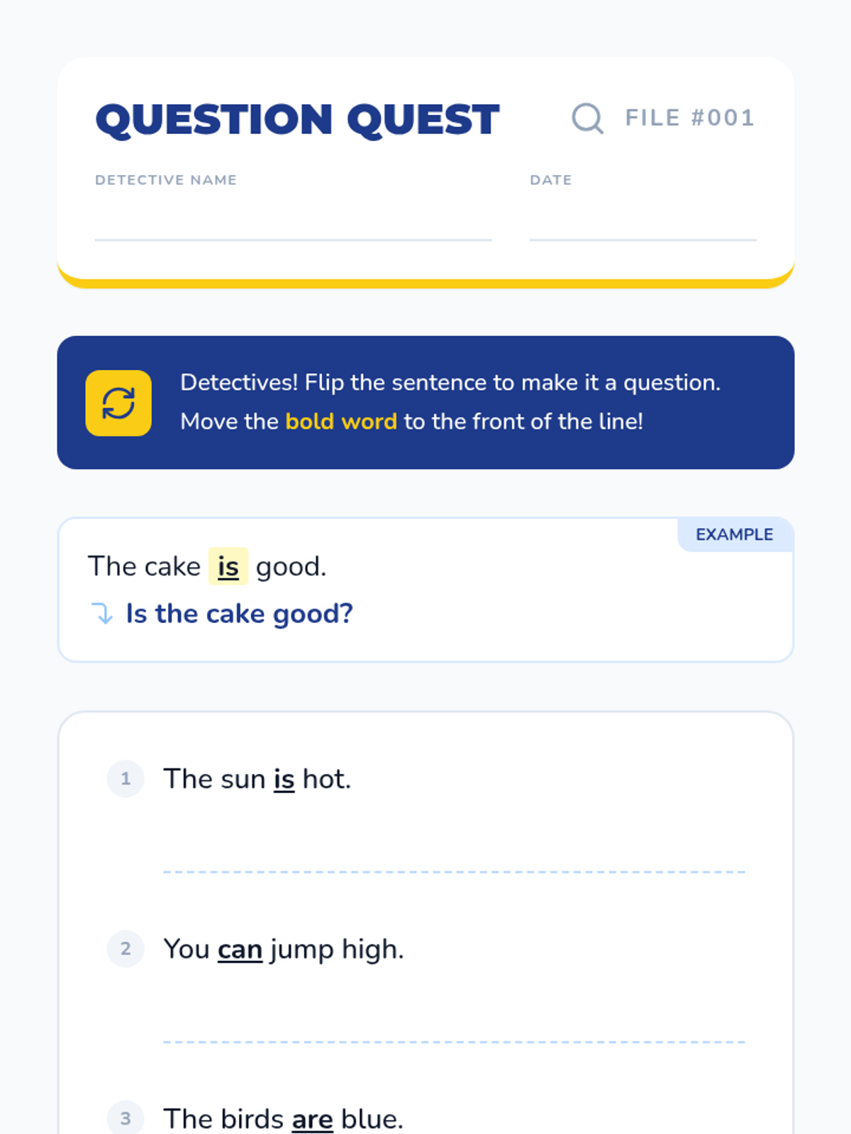 This sequence guides 1st-grade students through the transition from oral questioning to written expression. It covers syntax (the 'subject-verb flip'), punctuation (the question mark), sentence structure (unscrambling), and creative writing using picture prompts, culminating in editing skills.