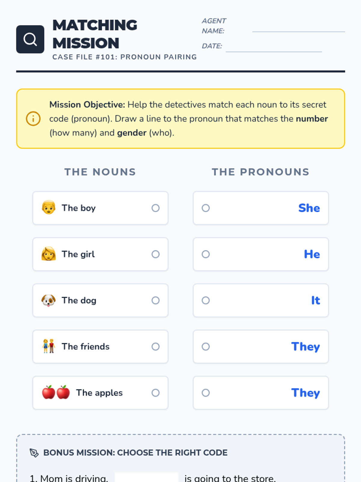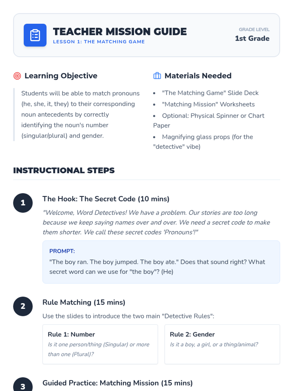 A 1st Grade ELA sequence where students become 'Word Detectives' to master pronoun-antecedent agreement. Students move from matching nouns to pronouns based on number and gender to identifying and fixing confusing pronoun errors in text.