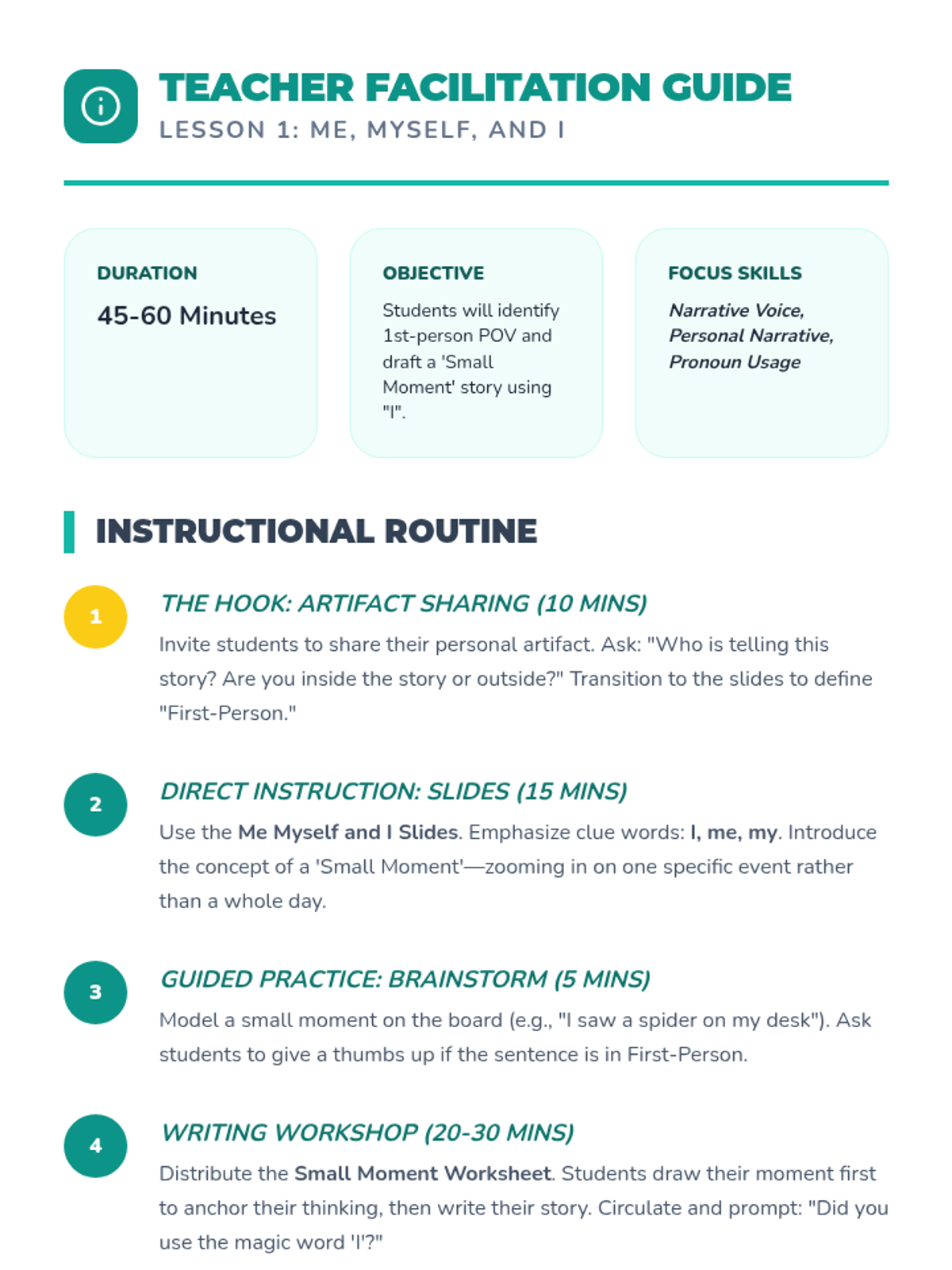 A first-grade sequence introducing the concept of narrators. Students learn to use pronoun clues (I, me, my vs. he, she, they) to determine who is telling a story through detective-themed activities and workshop-style lessons.