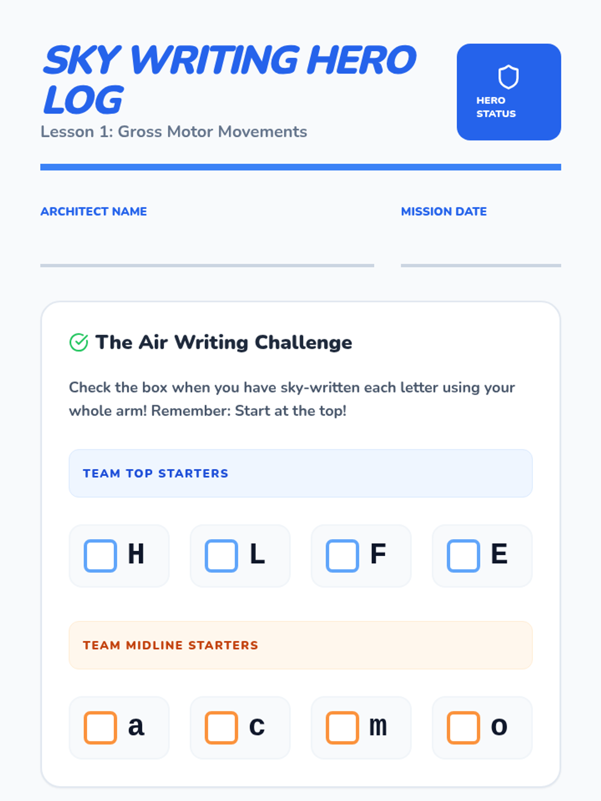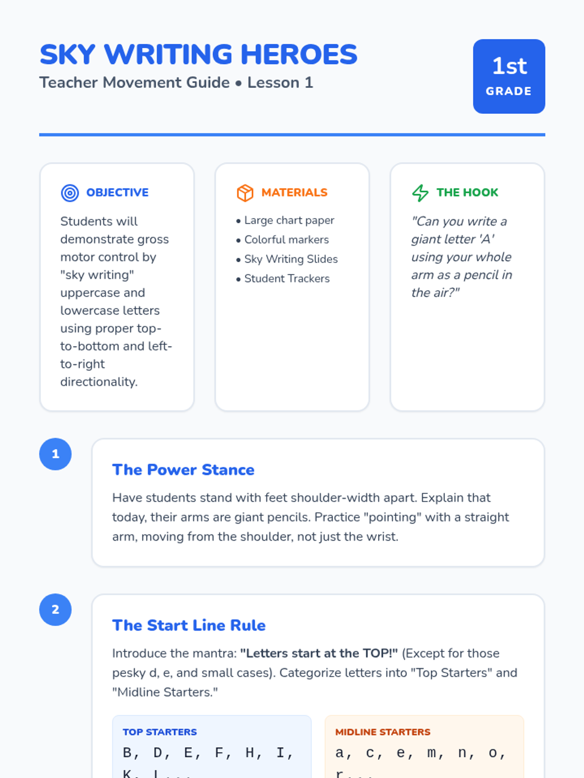 A multi-sensory workshop sequence for 1st-grade students to master the mechanics of letter formation. Students move from gross motor movements to fine motor precision, grouping letters by shape and line placement to build legibility and fluency.
