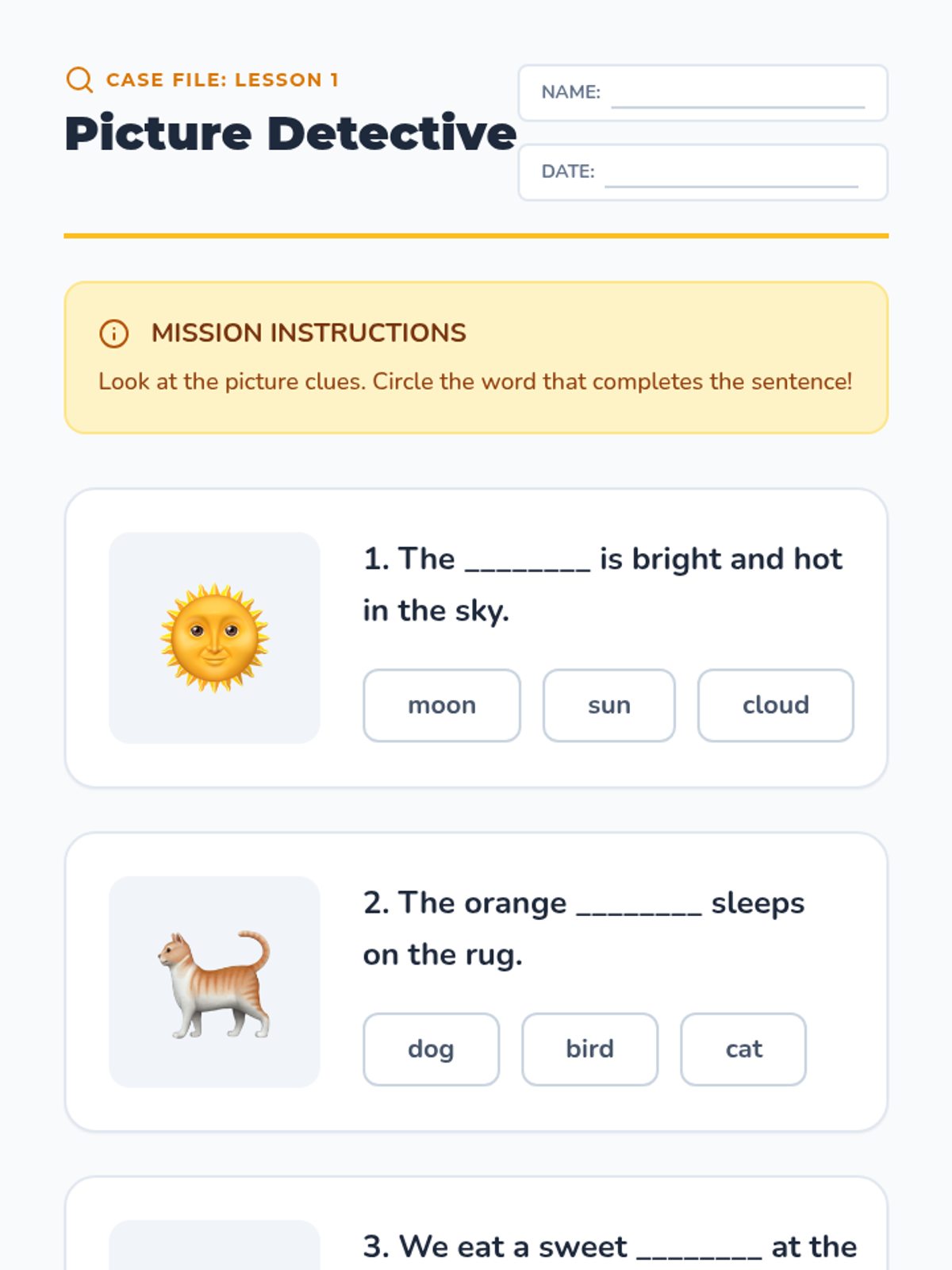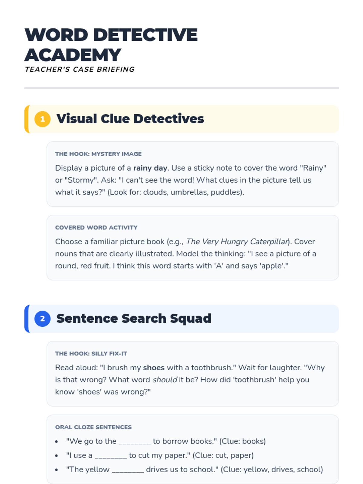 A foundational ELA sequence for 1st graders that builds context clue skills through a 'Word Detective' lens, moving from visual literacy to textual analysis. Students learn to use illustrations, sentence clues, and helper words to decode meaning, concluding with a workshop to apply their skills to new texts.