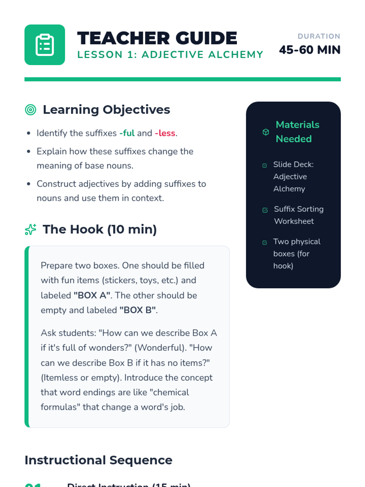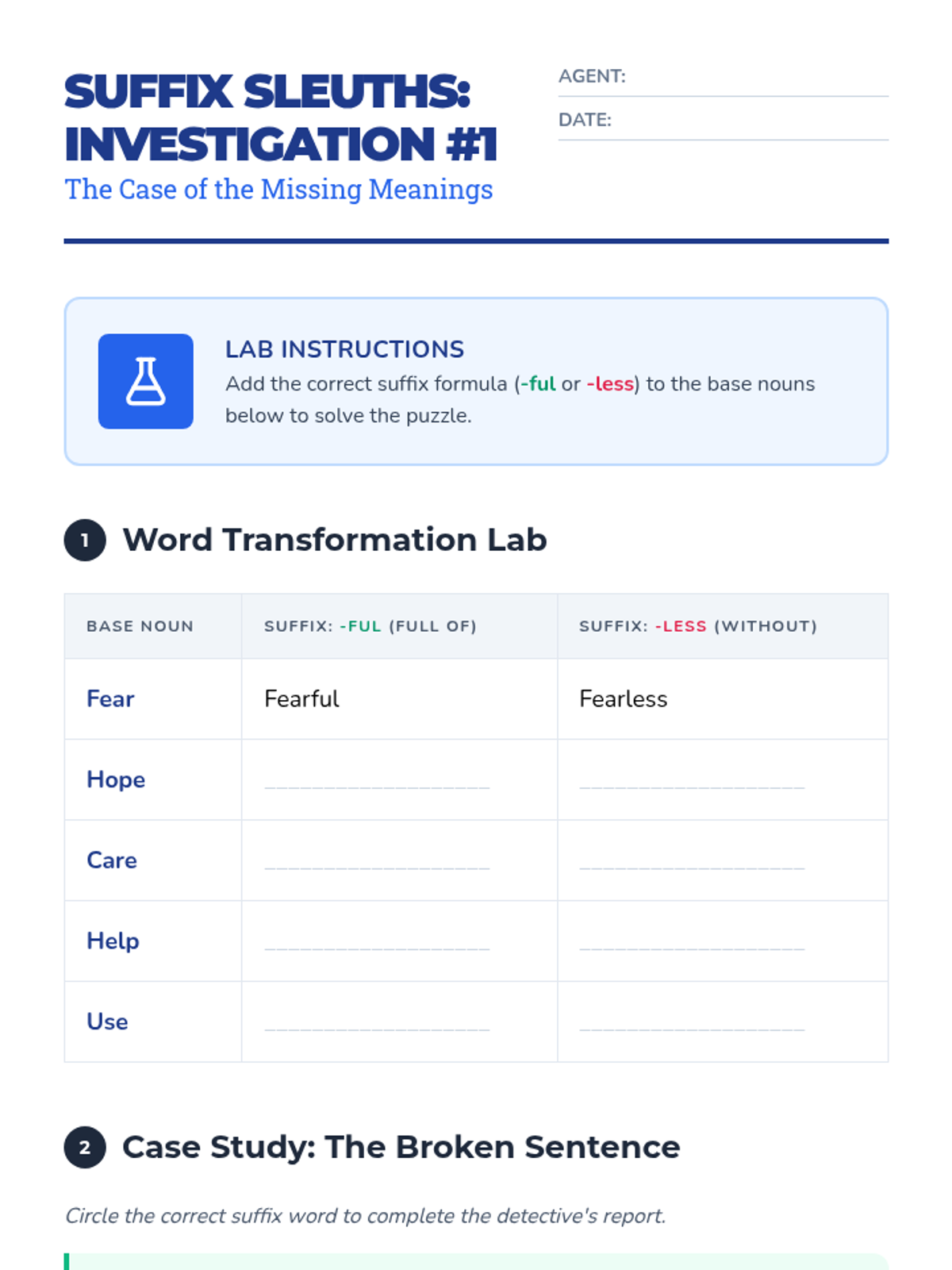 Students investigate how suffixes (-ful, -less, -ly, -er, -est) change word meanings and parts of speech. Using a 'Word Lab' detective theme, students analyze patterns, play games, and master spelling rules for word modification.