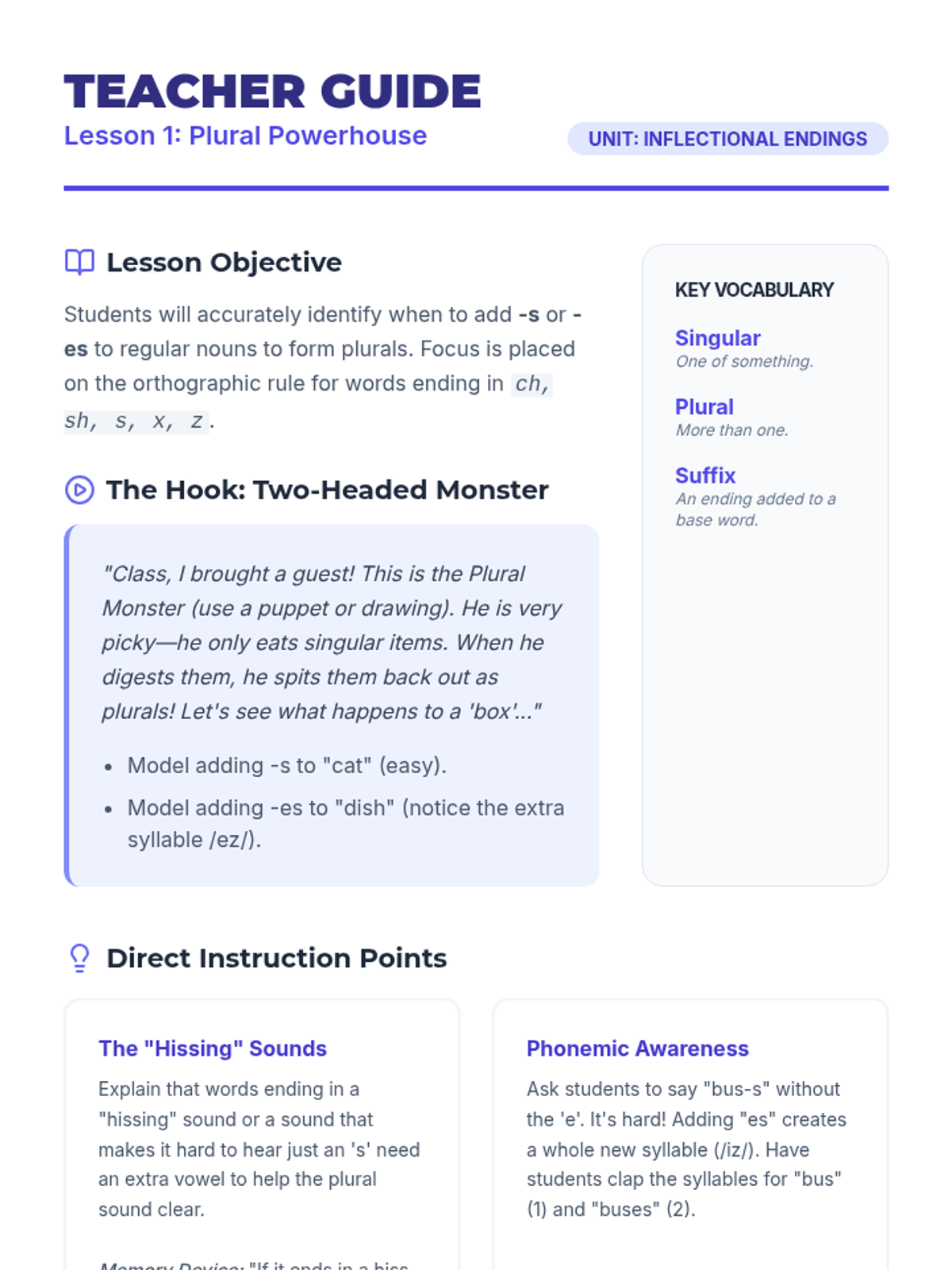 This sequence systematically addresses how base words change when suffixes are added, a critical morphological skill for second graders. Students will explore rules for pluralization and past tense, specifically focusing on the 'doubling rule' and 'dropping the silent e'. By the end, students will demonstrate the ability to modify base words correctly before adding endings like -ed, -ing, -s, and -es.