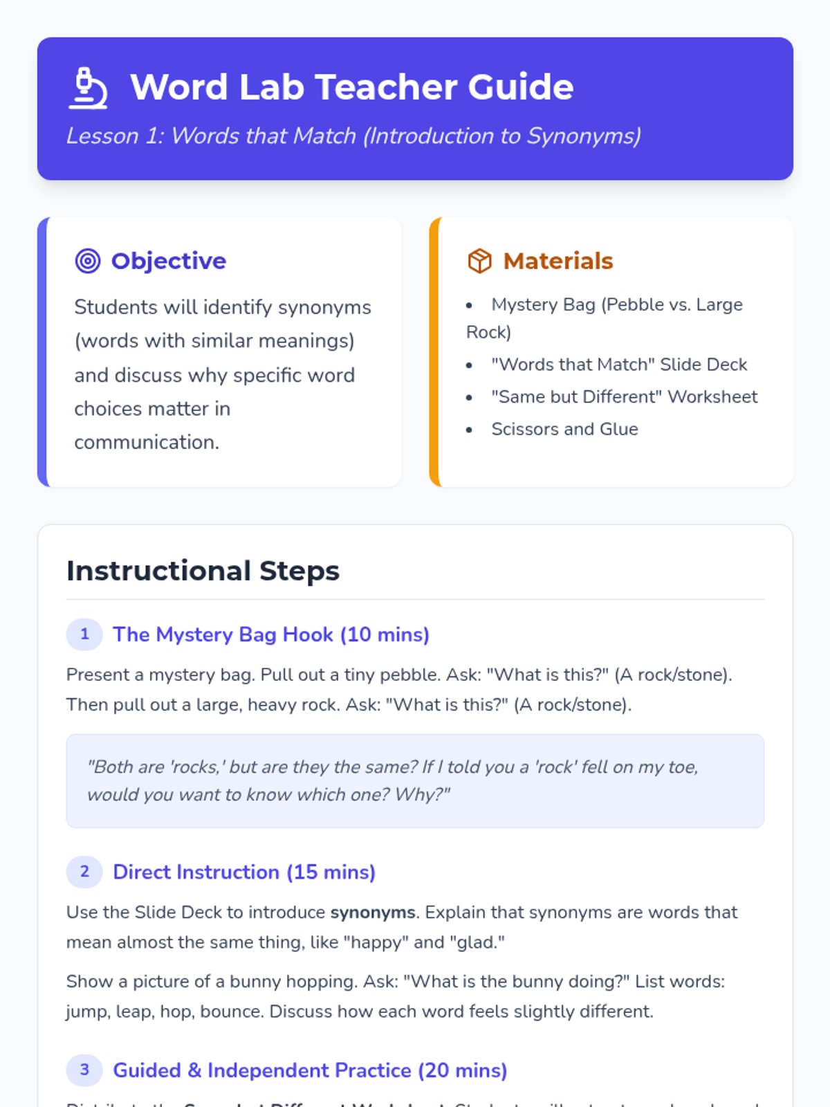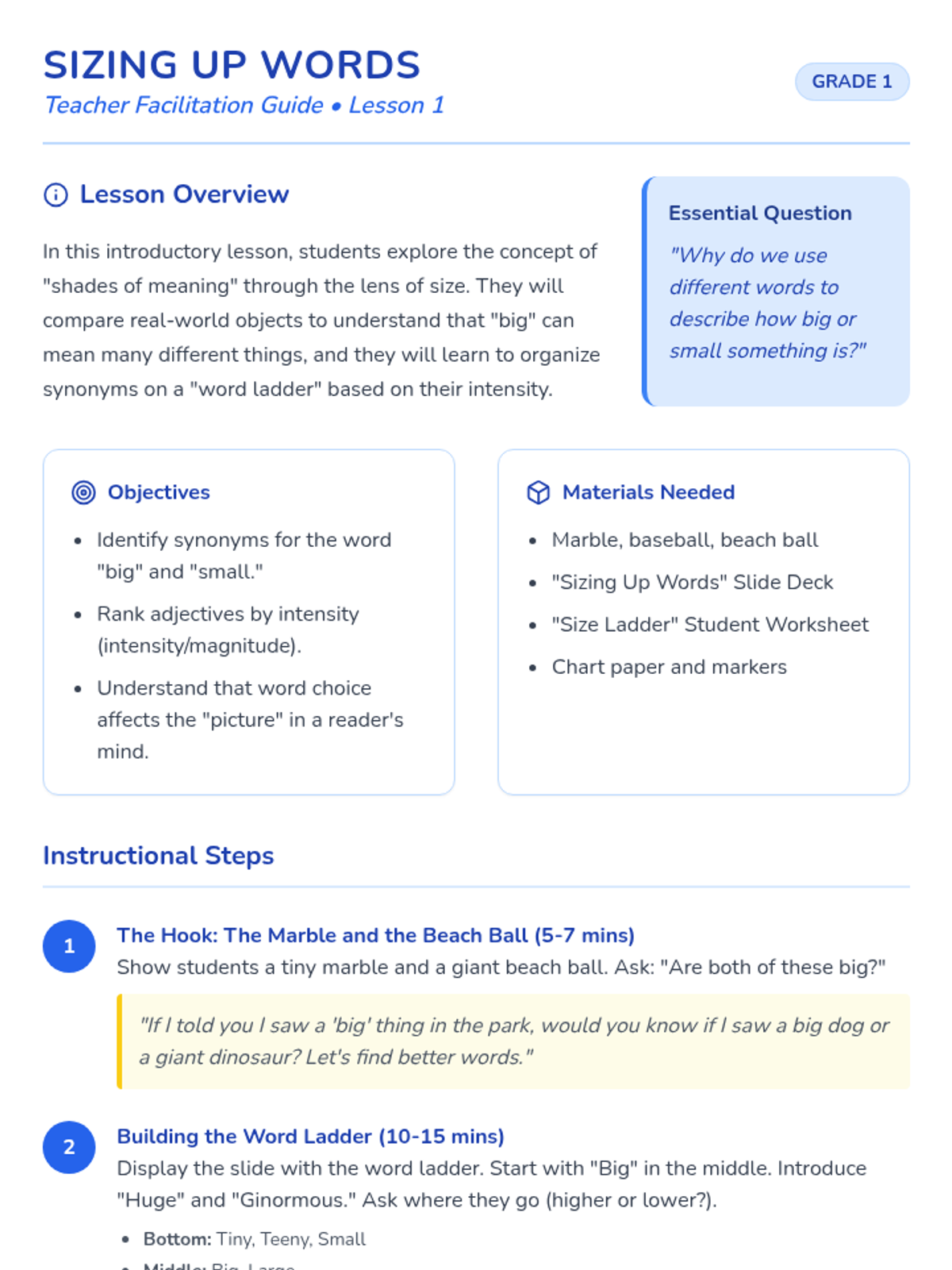 This first-grade sequence explores 'shades of meaning' in verbs and adjectives. Students learn to distinguish between related words by intensity, manner, and emotion through physical enactment, visual scaling, and sentence revision, helping them become more precise writers and readers.