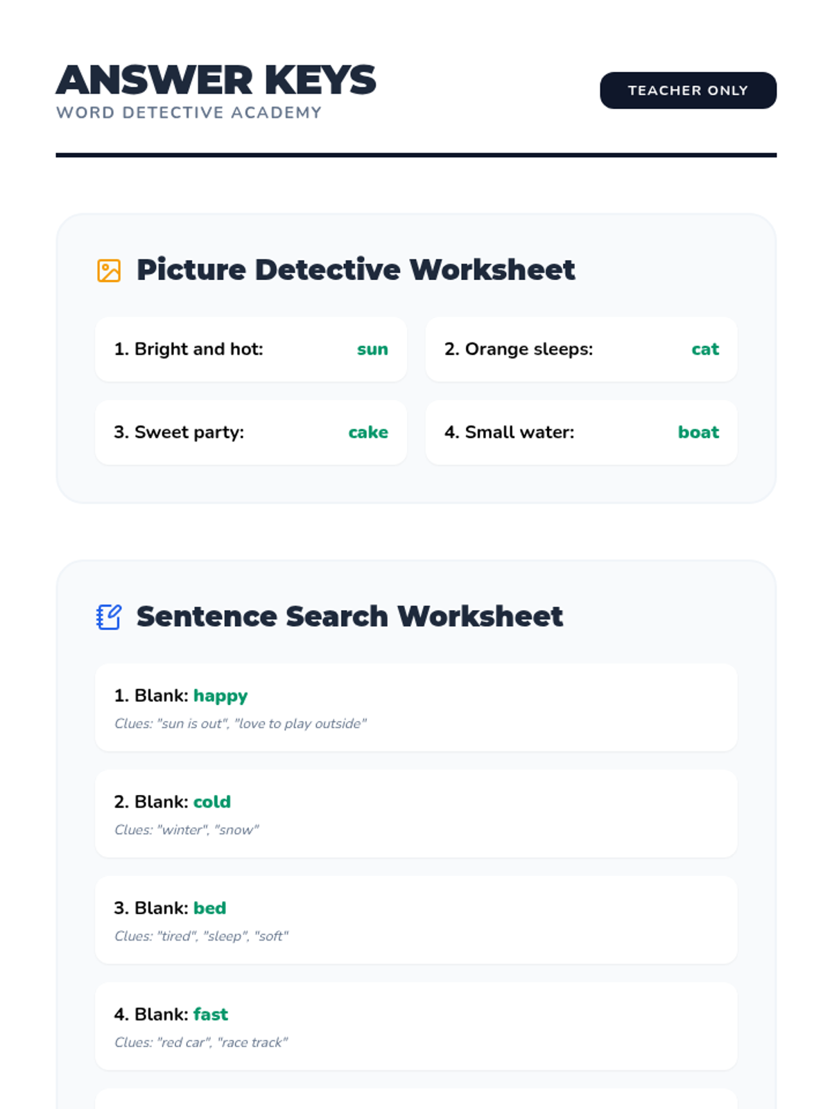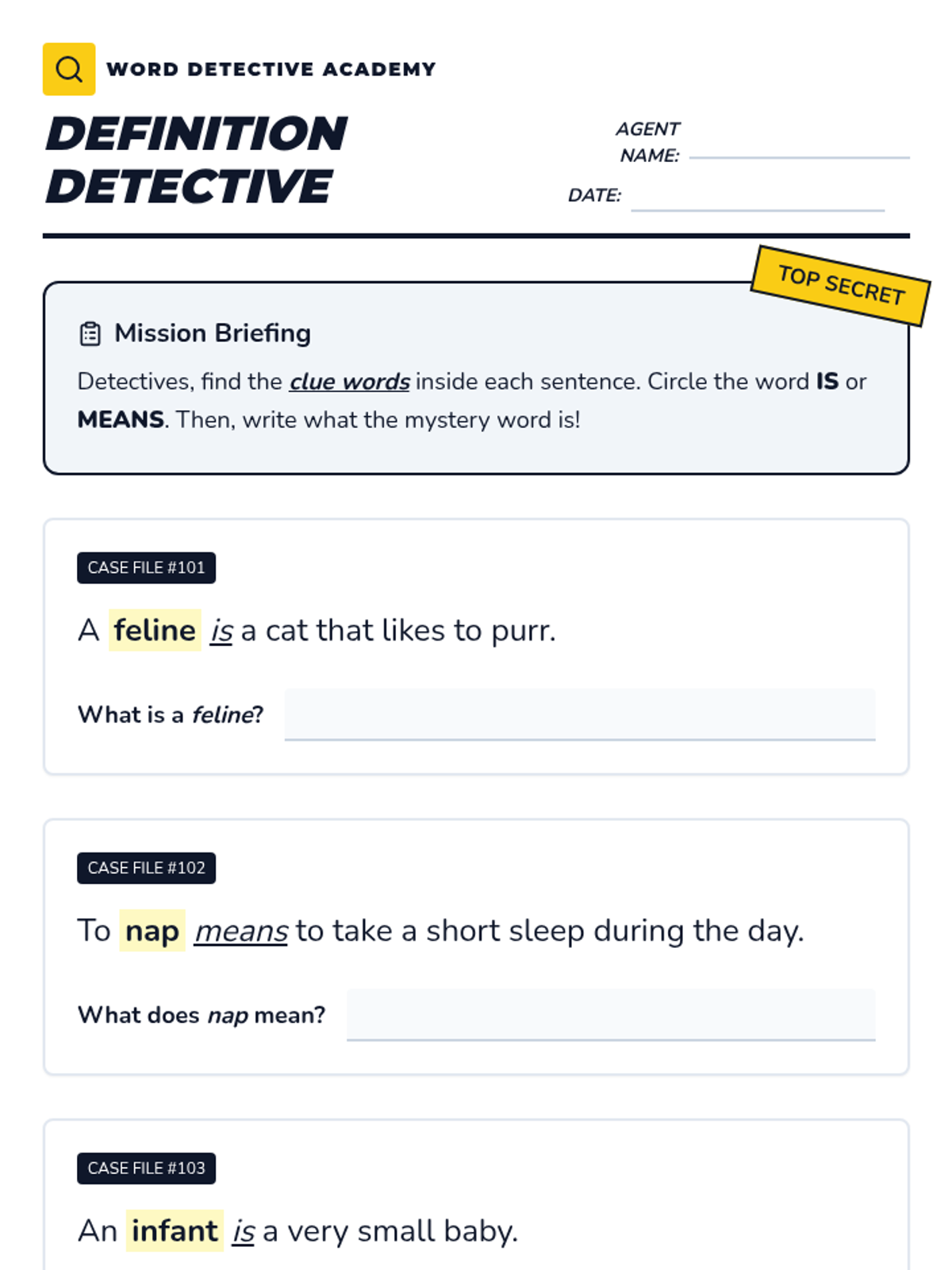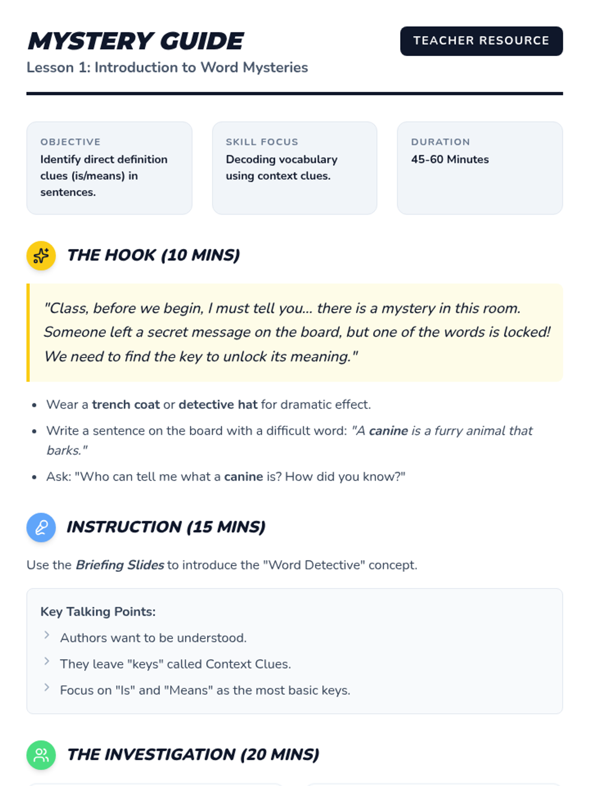 A 1st Grade ELA sequence that uses a 'Word Detective' theme to teach students how to identify specific context clues (definitions, synonyms, antonyms, and examples) to decode unknown vocabulary. Students progress from guided investigations to independent case-solving, building logical reasoning and word relationship skills.