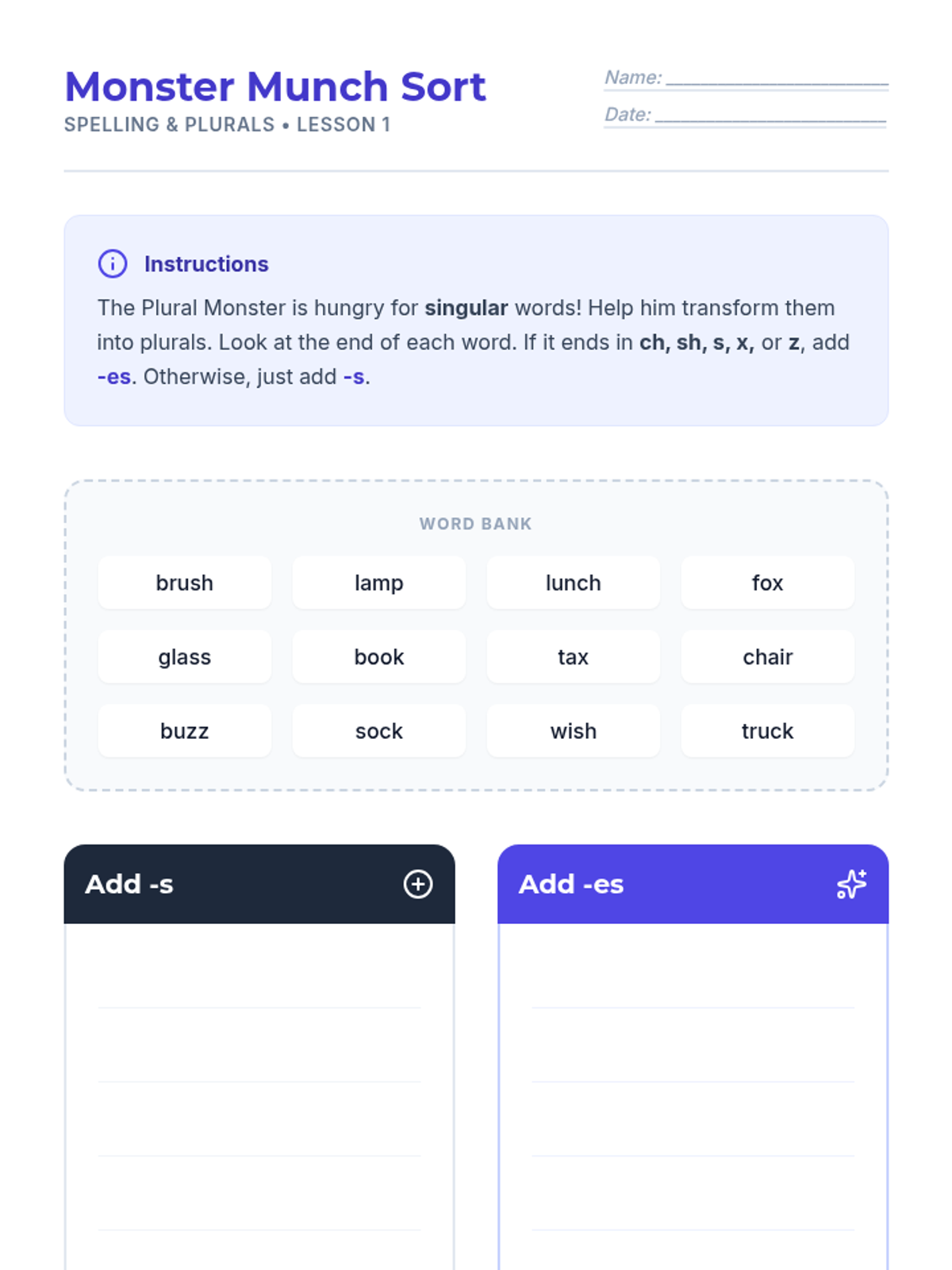 A comprehensive first-grade sequence exploring singular and plural nouns. Students learn to distinguish between 'one' and 'more than one' and master the application of -s and -es suffixes through interactive activities, scavenger hunts, and sentence building.