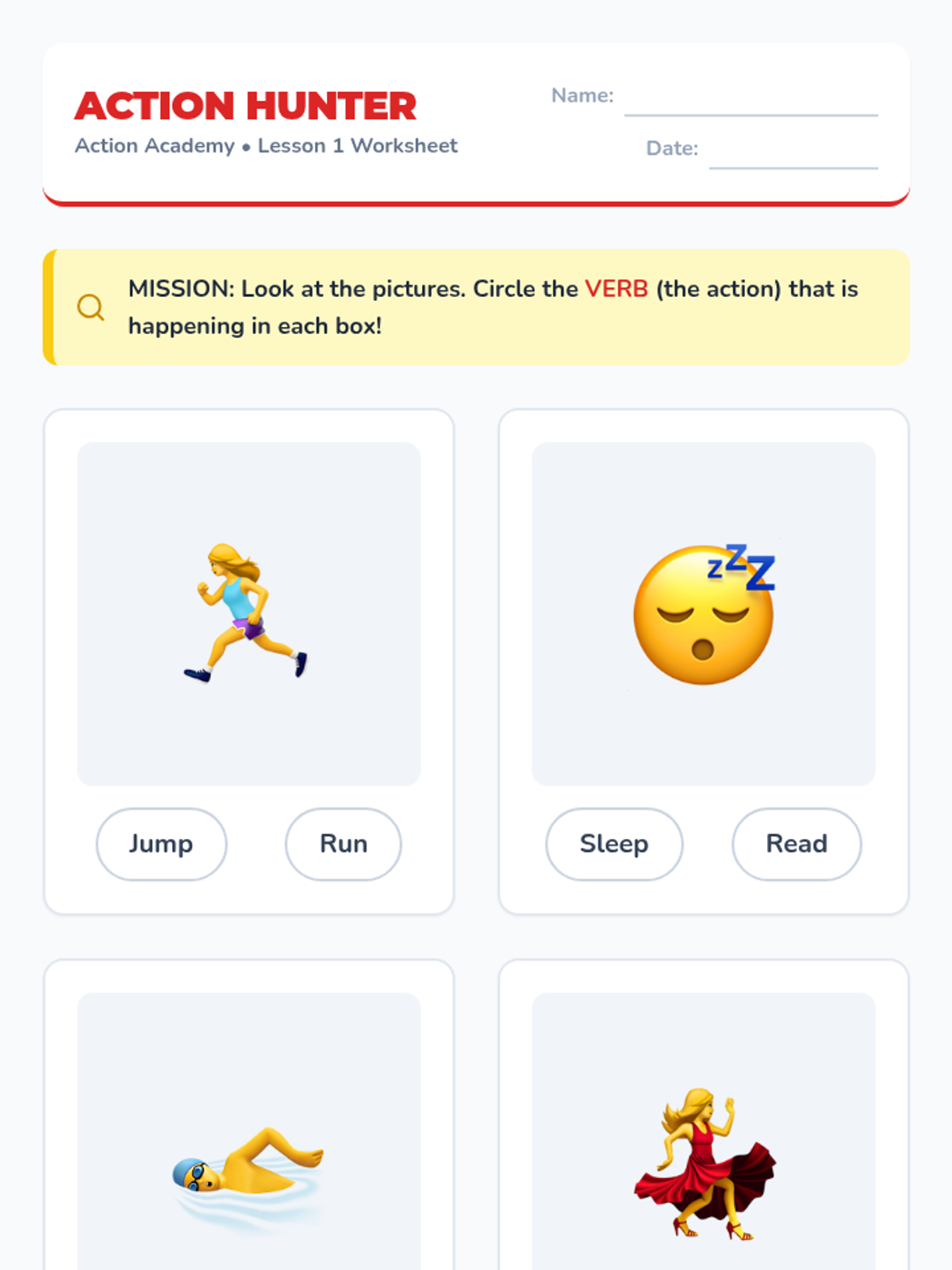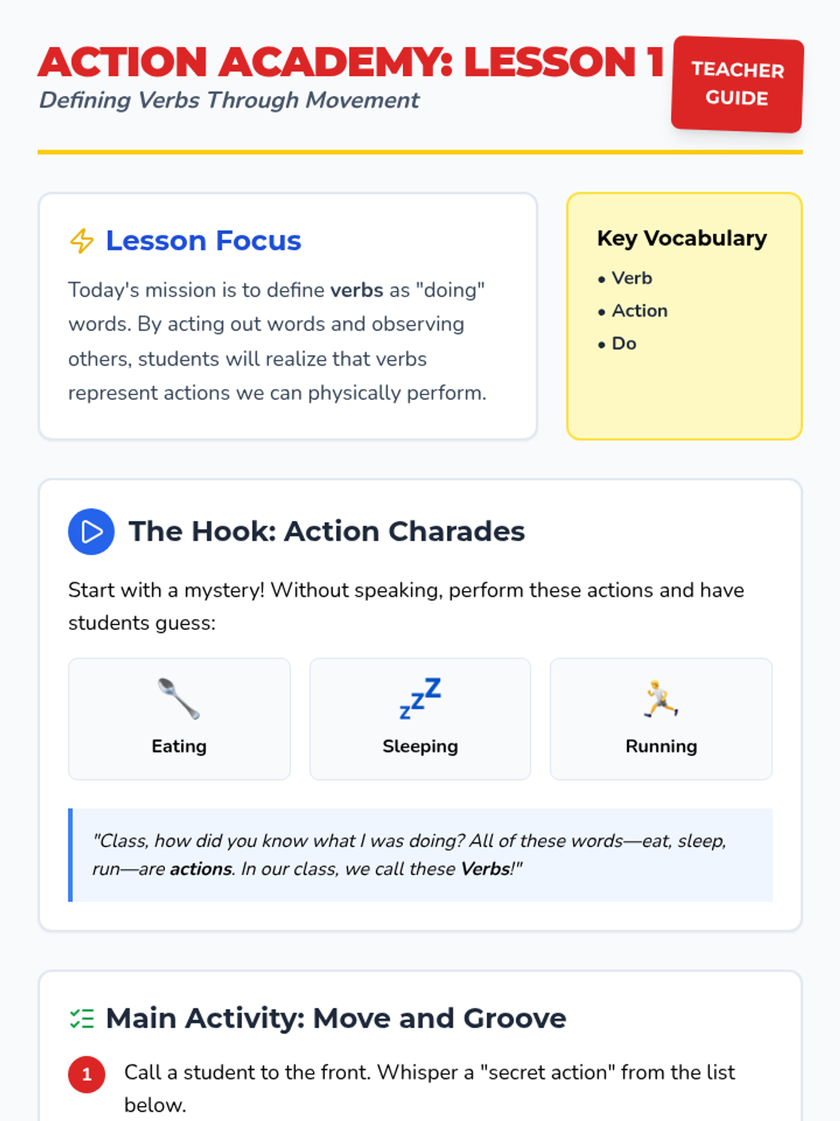 A comprehensive 1st-grade sequence introducing action verbs through movement, categorization, subject-verb agreement, and creative writing. Students move from basic identification to using specific, descriptive verbs in their own sentences.