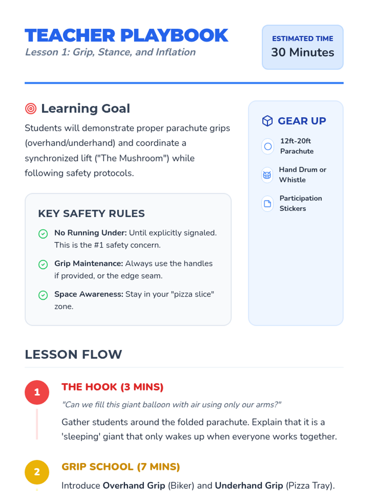 A 1st-grade Physical Education sequence focused on whole-class coordination and cooperation through parachute play. Students progress from basic mechanics to complex object control and spatial awareness games, concluding with group reflection and self-regulation.