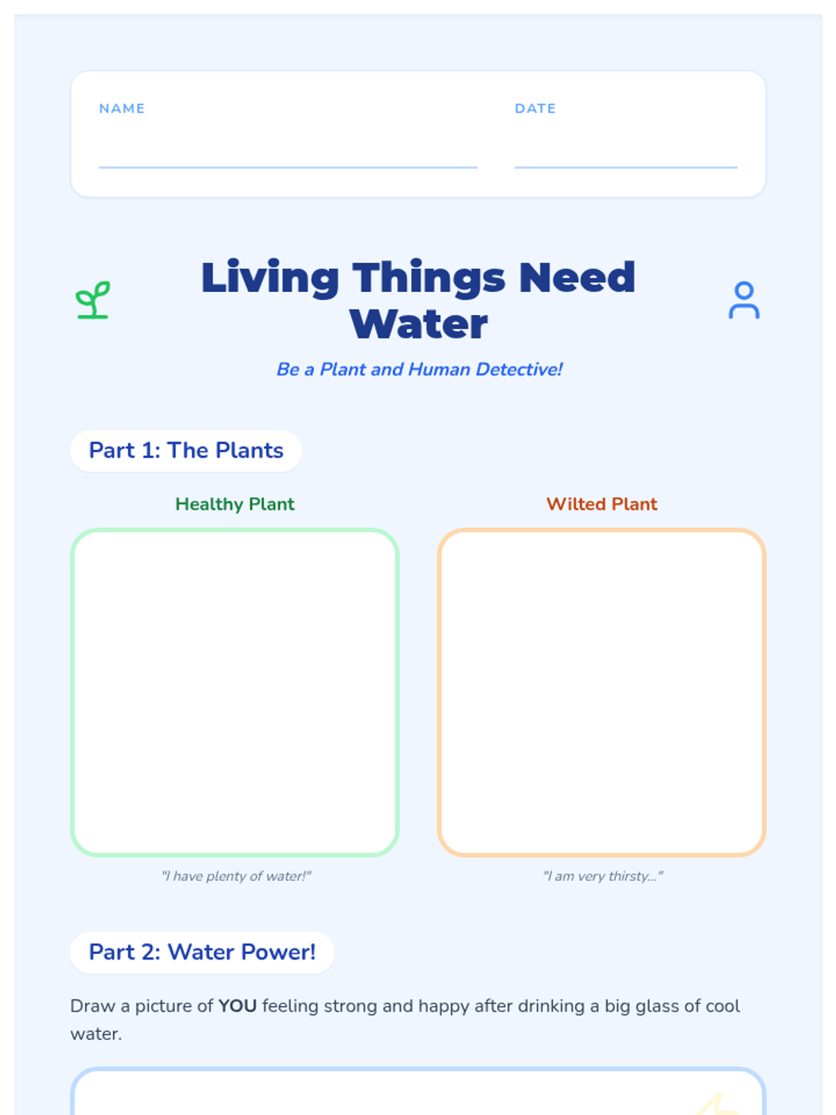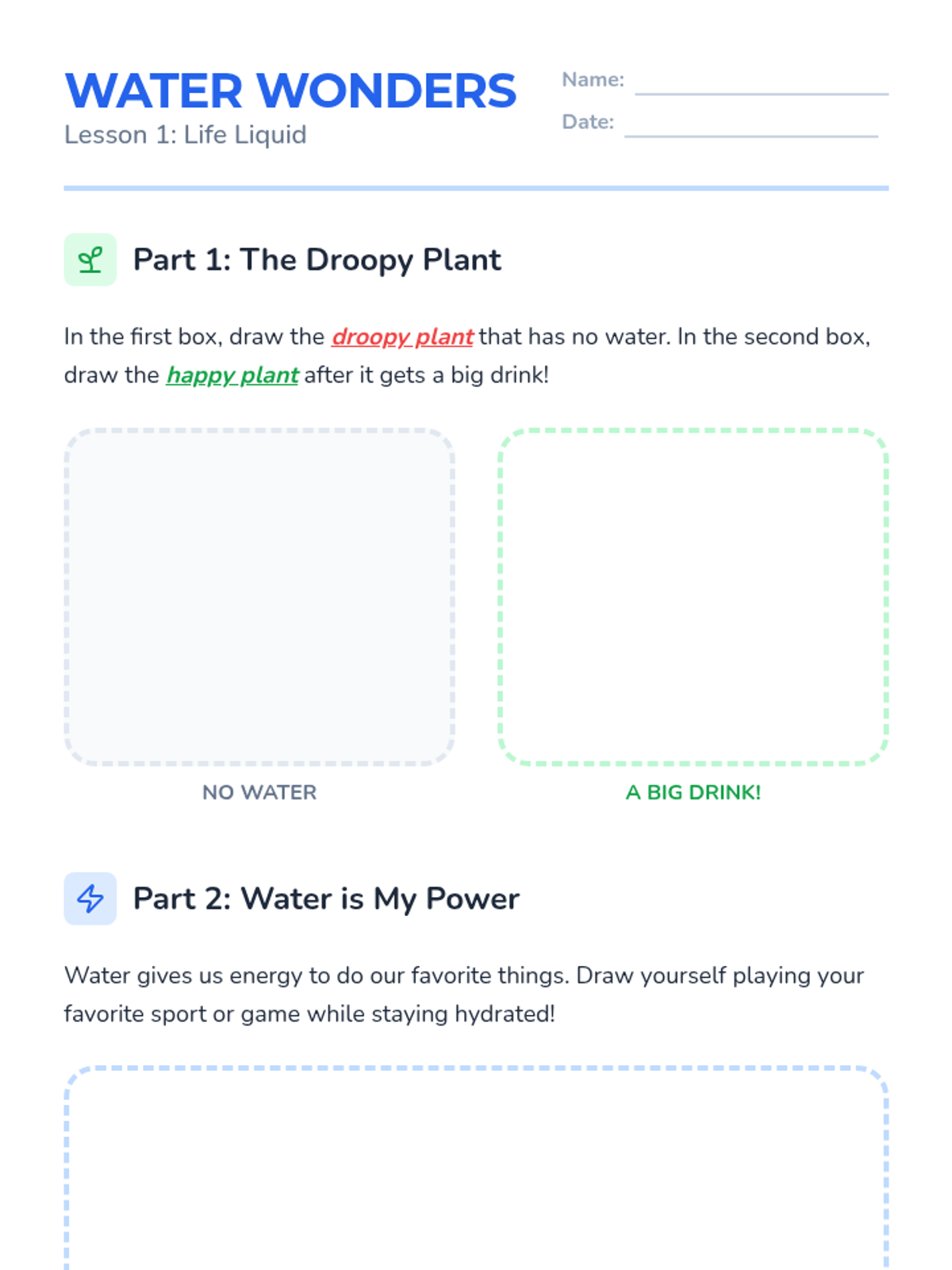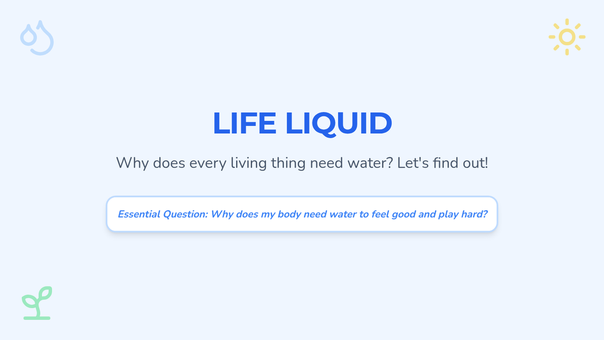 This inquiry-based sequence for first-grade students explores the biological necessity of water. Students learn to recognize physical signs of thirst, understand water loss through sweat, and monitor their hydration levels using urine color as a tool, ultimately connecting hydration to physical energy and mood.