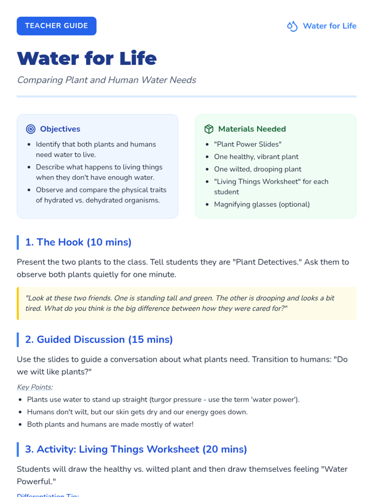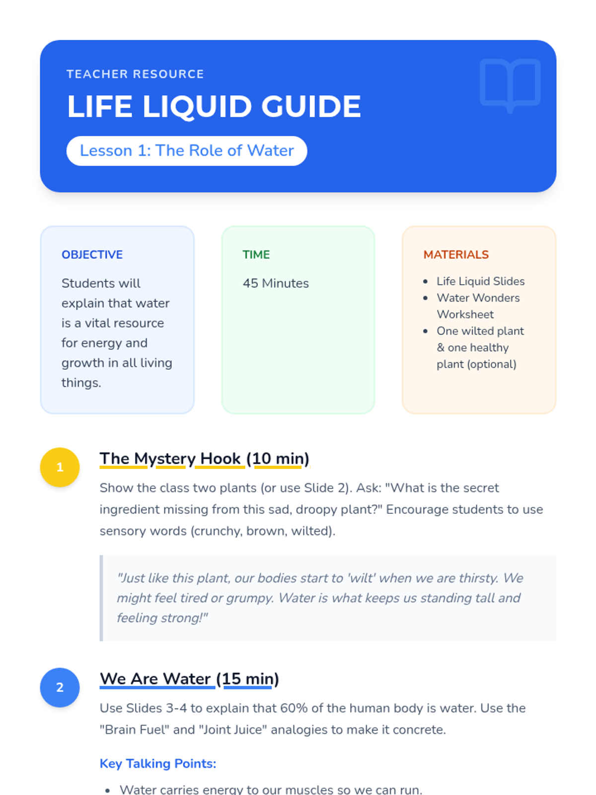 A 5-lesson sequence for 1st graders to understand the importance of water, recognize thirst signals, and develop healthy hydration habits through hands-on activities and visual aids.