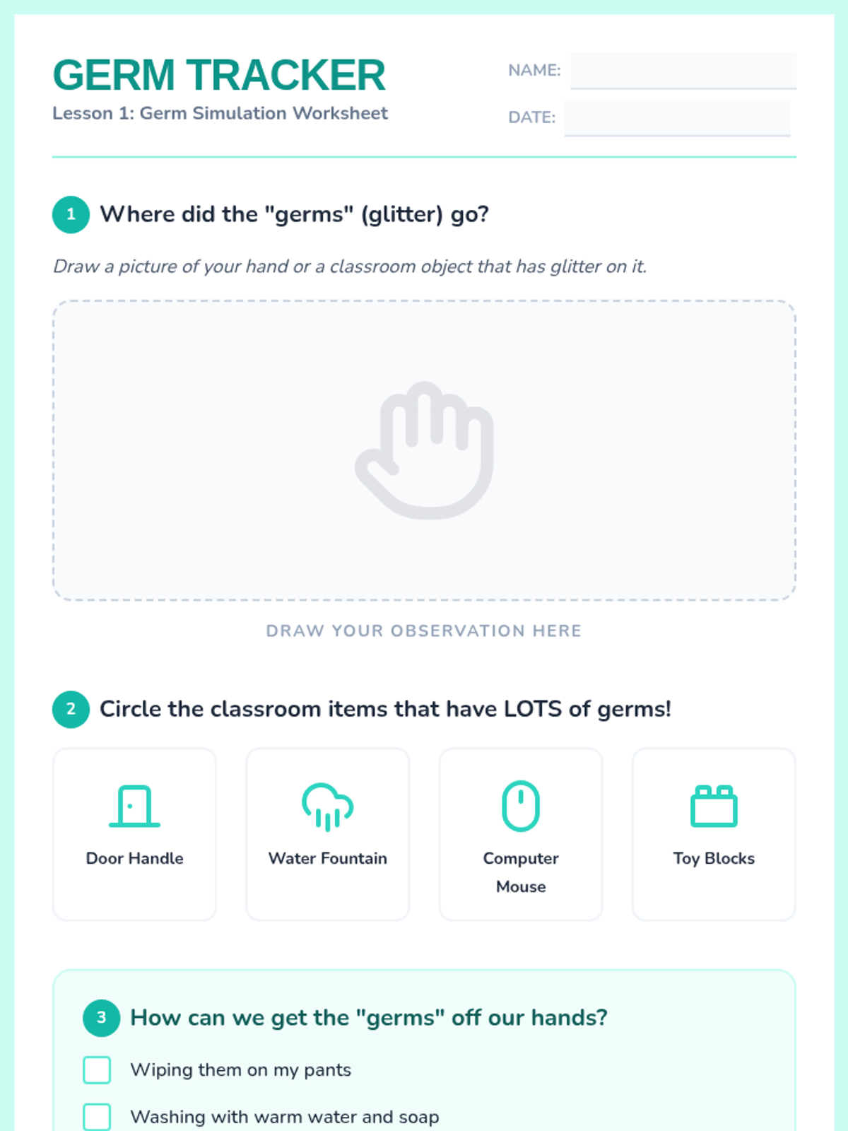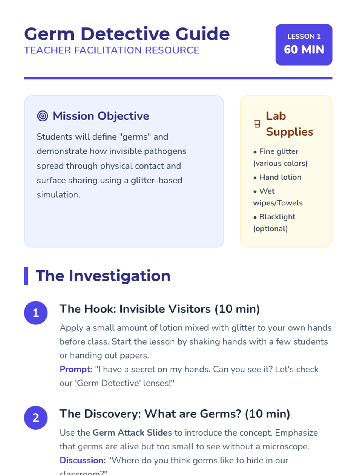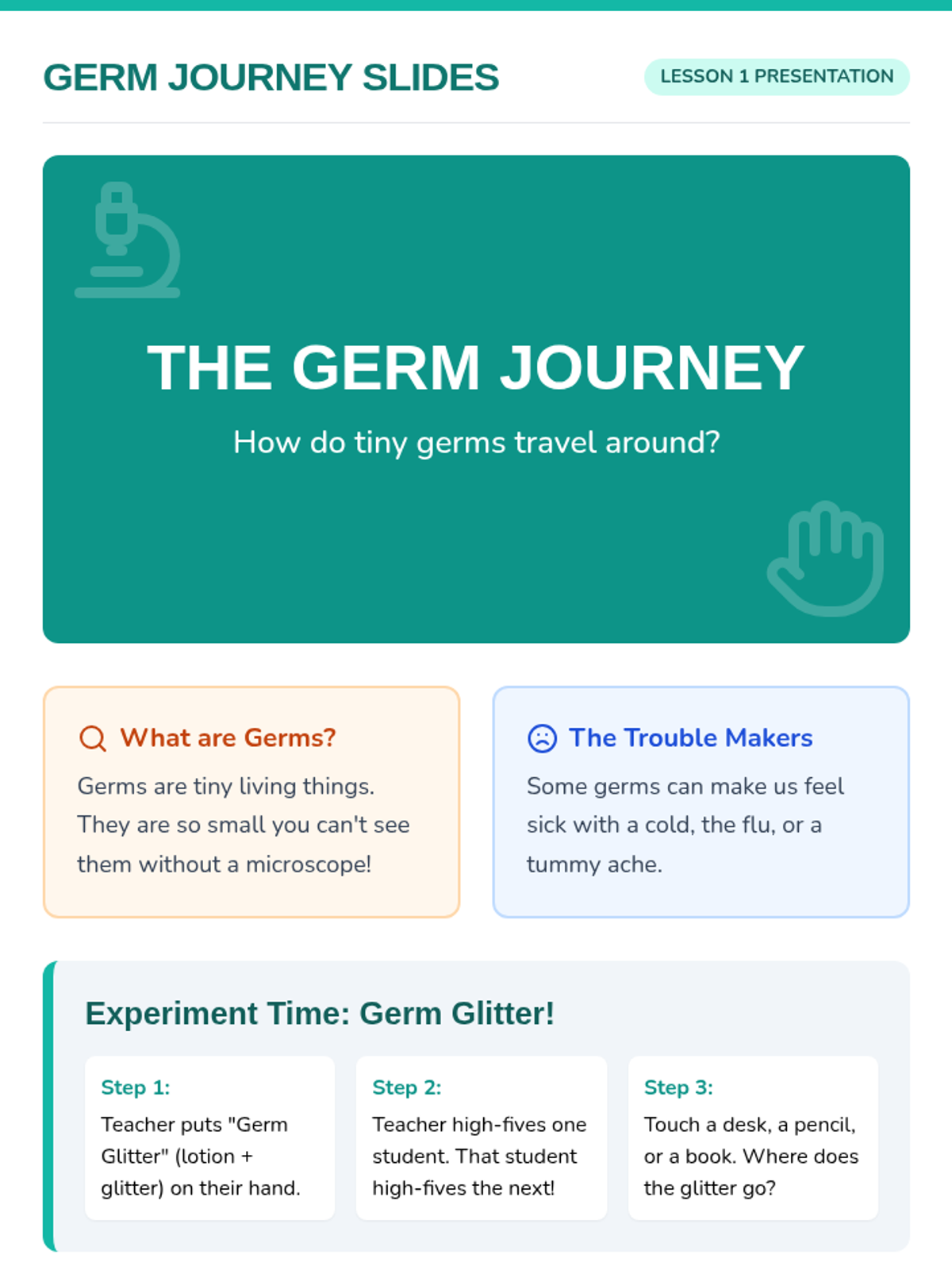 A hands-on health sequence for 1st graders to understand how germs spread and how to stop them through hygiene, respiratory etiquette, and healthy habits. Students participate in simulations, experiments, and creative projects to build a healthy classroom community.