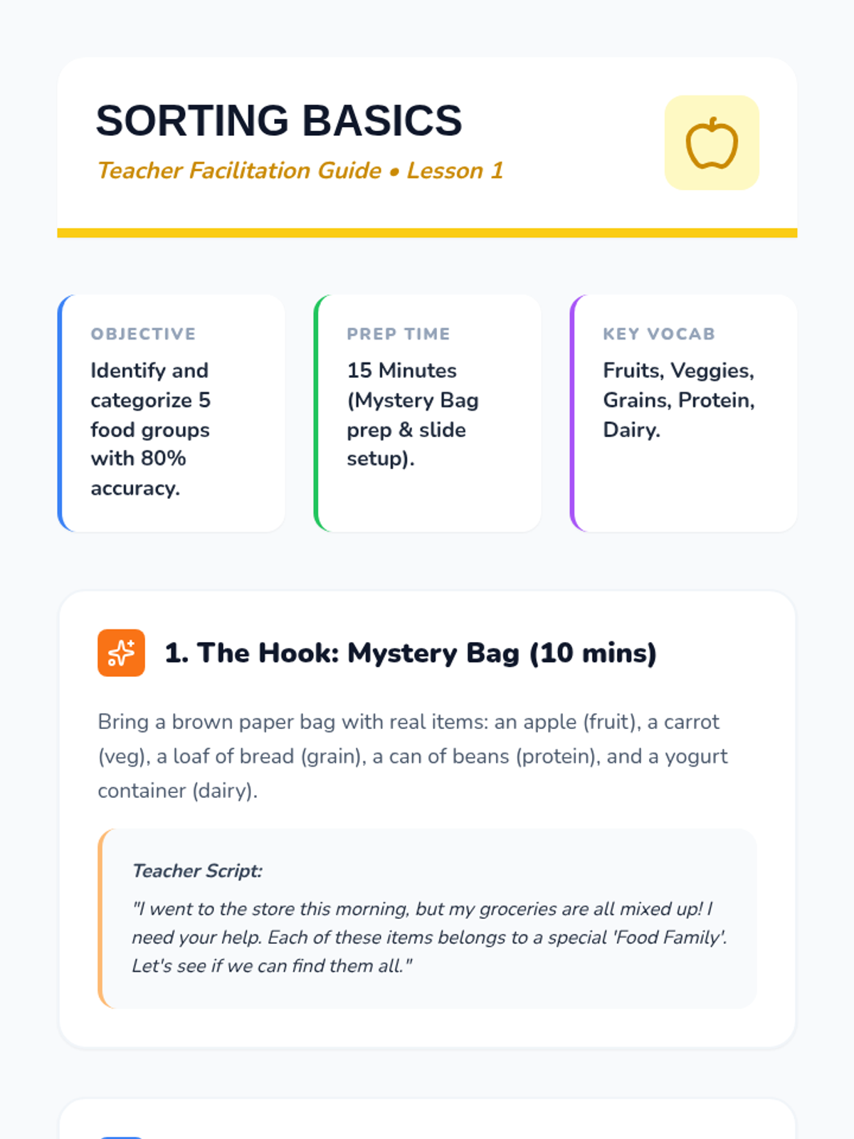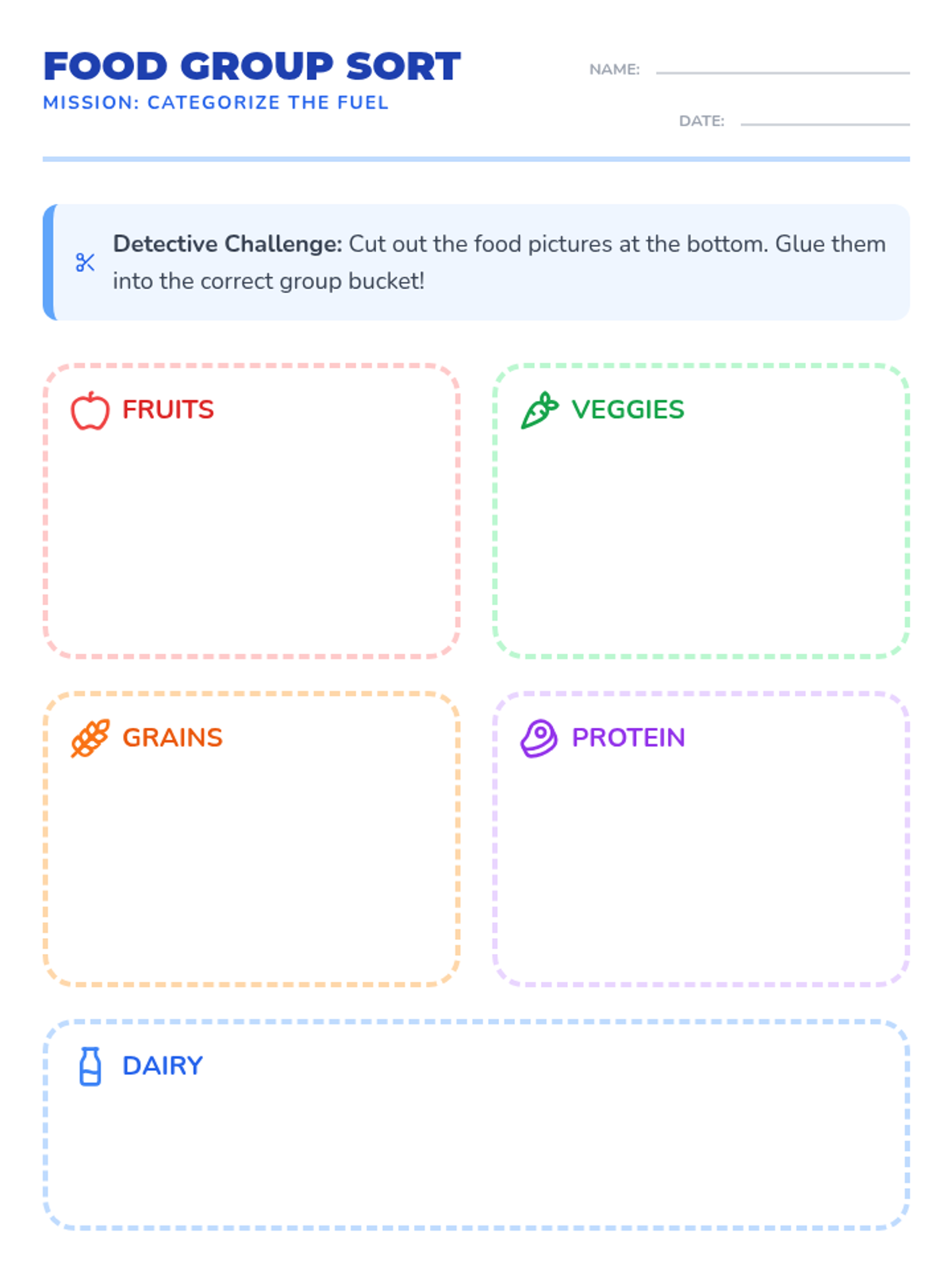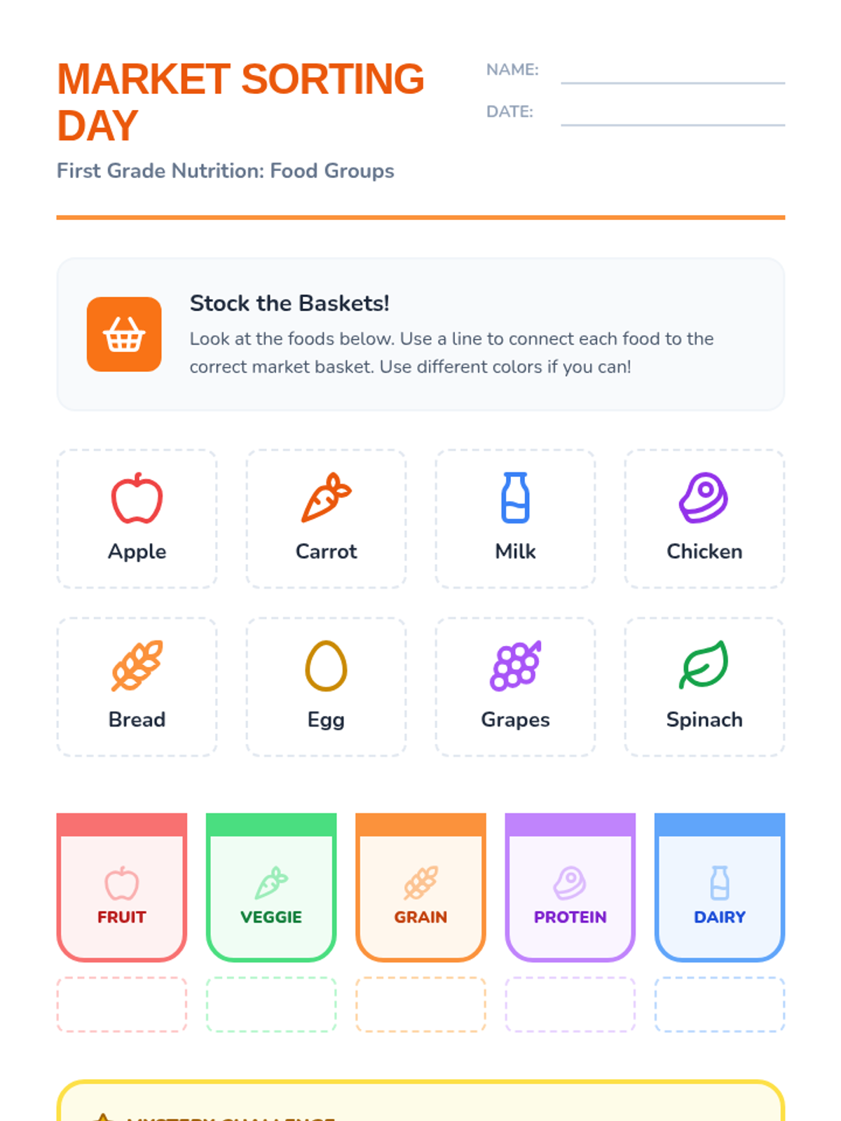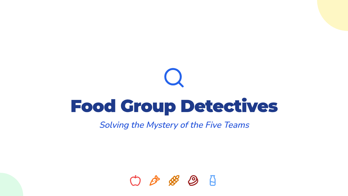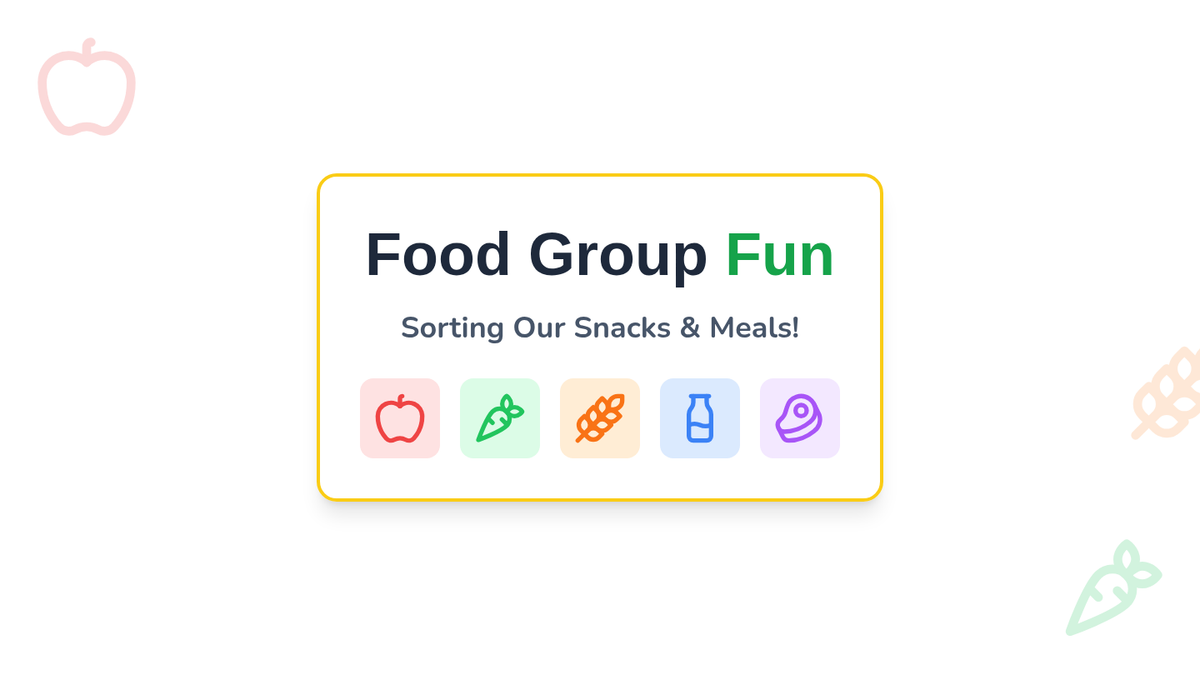 A comprehensive introduction to nutrition for first graders, focusing on identifying the five major food groups, understanding their health benefits, and learning how to build a balanced meal. Students progress from simple sorting to creative meal design through interactive games and visual activities.