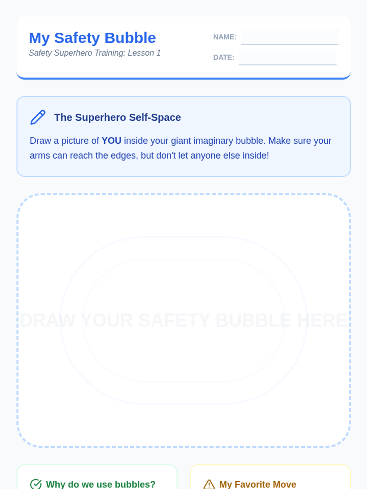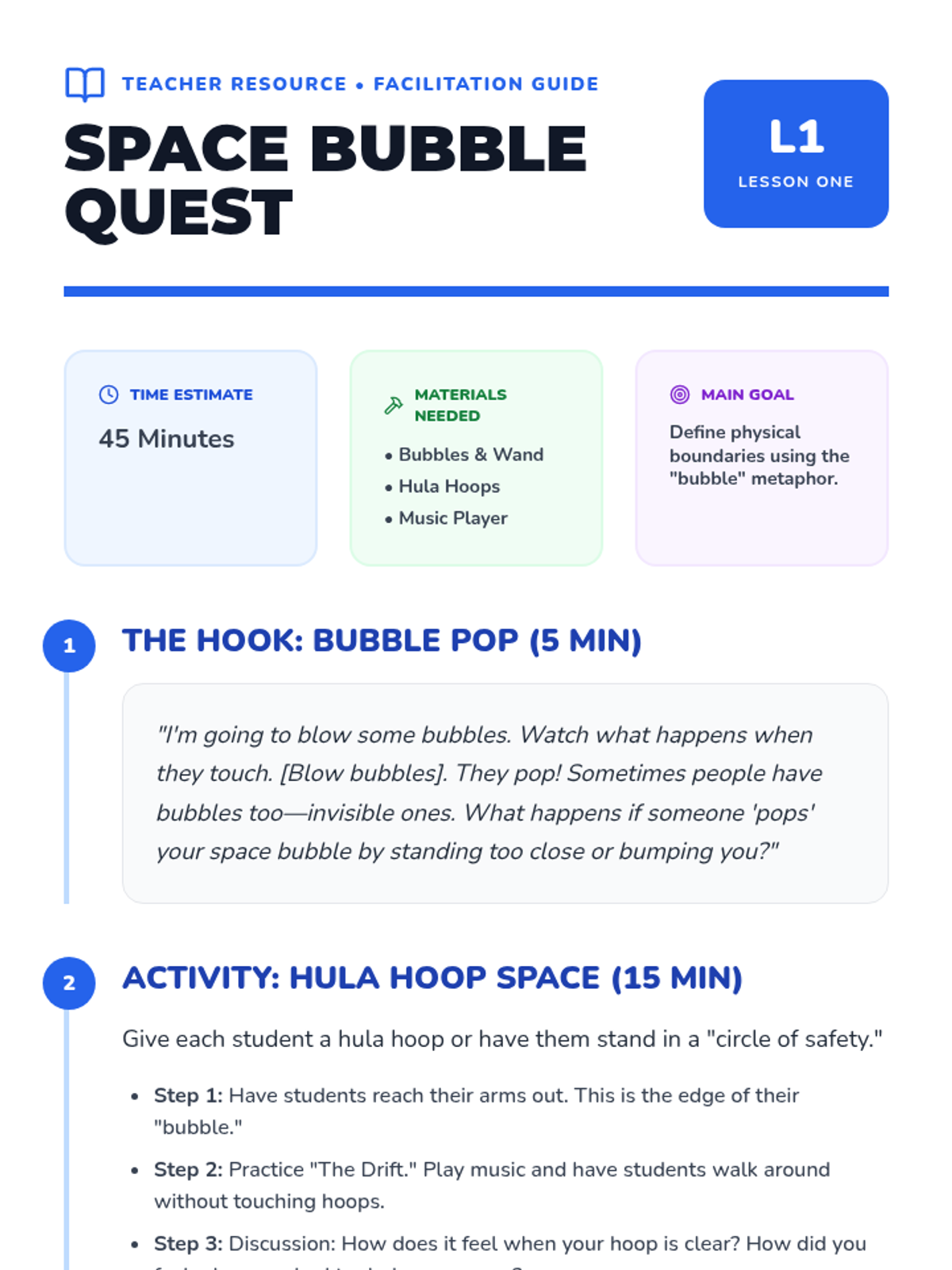 A comprehensive 5-lesson sequence for 1st-grade students focused on personal bodily autonomy, consent, and safety. Students learn to define their personal space, practice asking for permission, identify safe and unsafe touches, use assertive communication to set boundaries, and build a network of trusted adults.