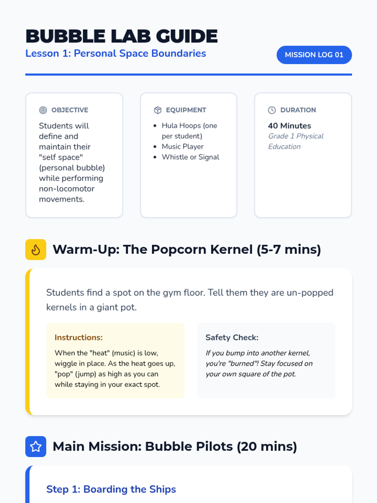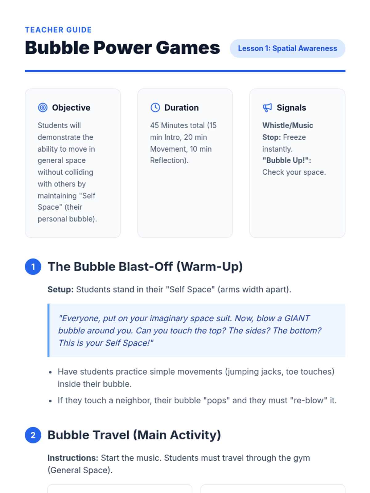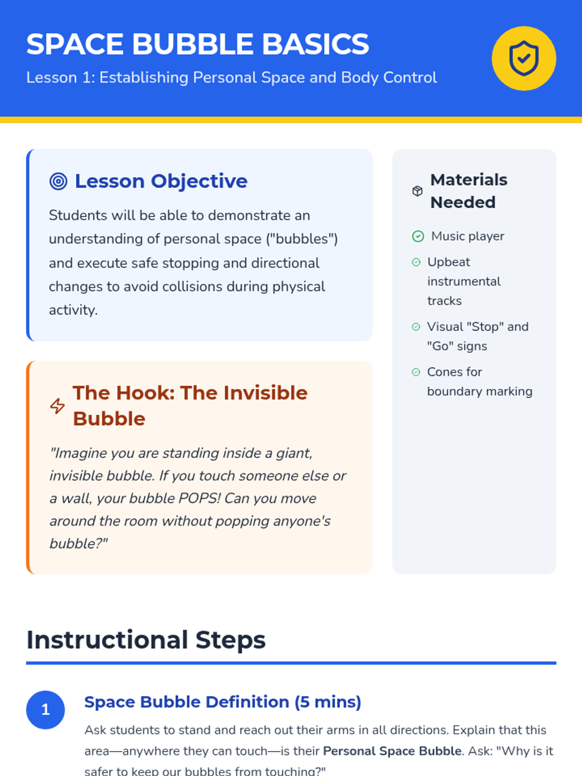 This 1st Grade PE sequence focuses on the fundamental safety aspect of spatial awareness, teaching students to distinguish between 'self space' and shared 'general space.' Through active games and structured movement challenges, students practice maintaining personal boundaries while navigating safely.