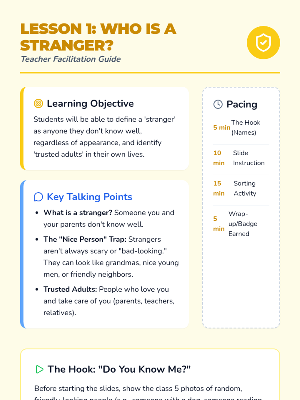 This sequence teaches 1st Grade students how to distinguish between strangers and community helpers, understand trust boundaries, and apply the 'Check-First' safety rule. Students move from basic definitions to situational assessment through interactive discussions and mapping activities.