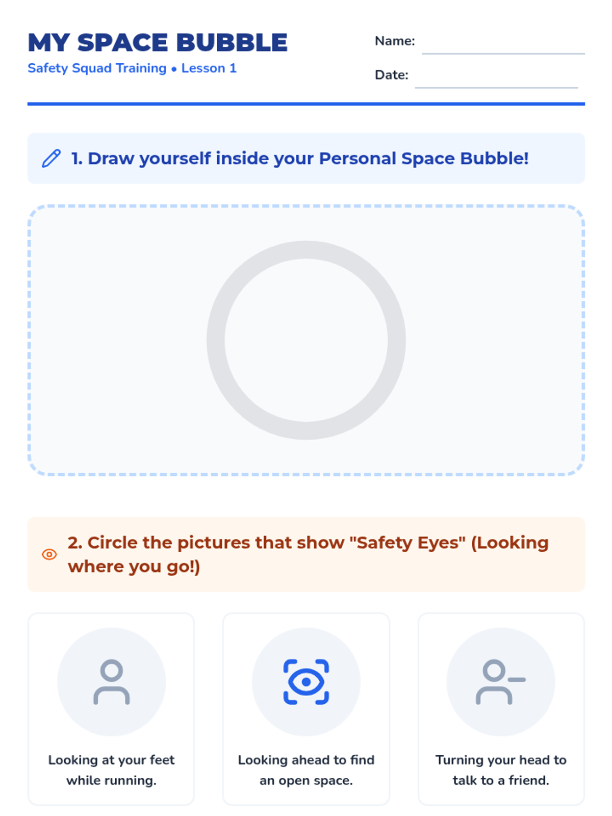 A 1st-grade physical education sequence focused on spatial awareness, hazard identification, and safe movement practices to prevent injuries during physical activity. Students learn to navigate space safely, prepare their bodies for exercise, and handle equipment responsibly.