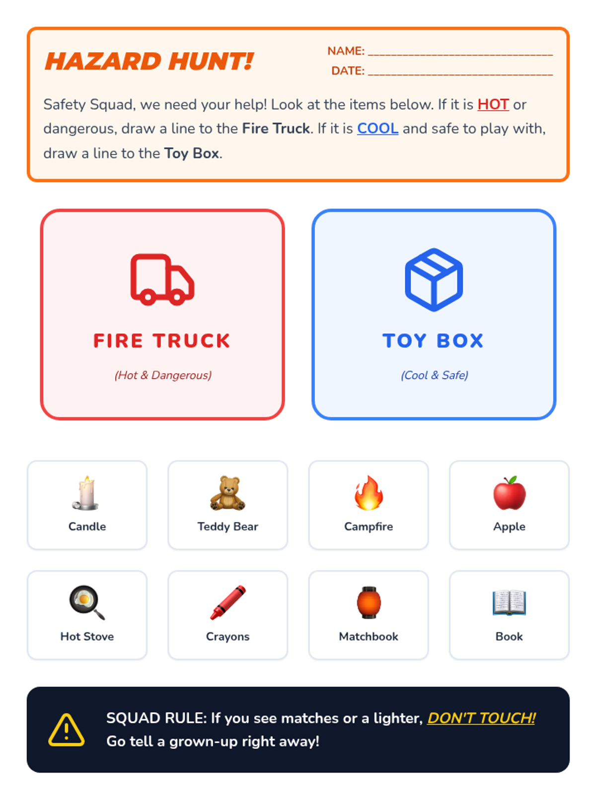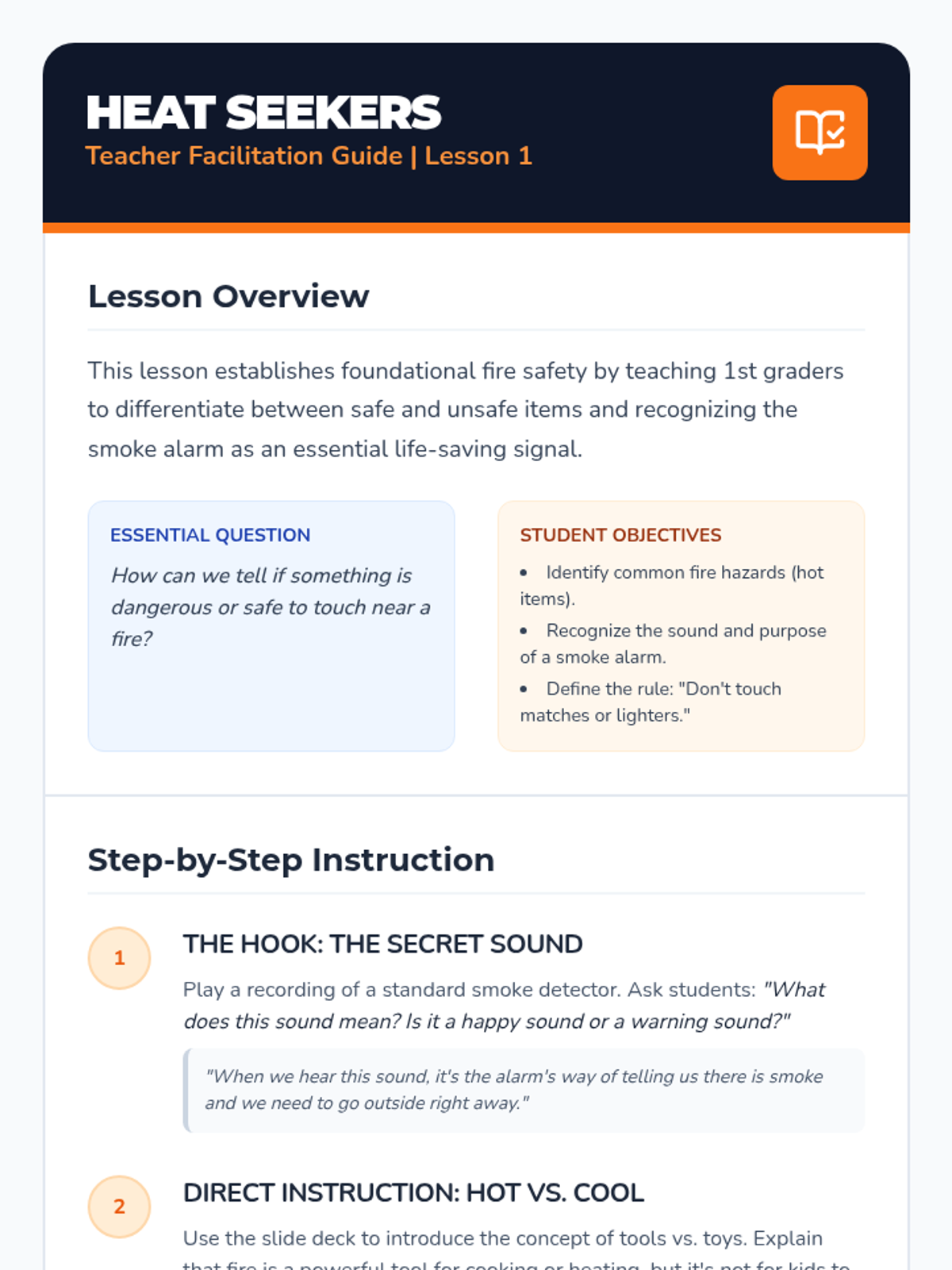 This sequence focuses on the critical cognitive and physical skills required for fire safety. Students move from understanding the science of fire to designing strategic escape plans and practicing survival maneuvers, empowering them to act as safety leaders in their homes and communities.