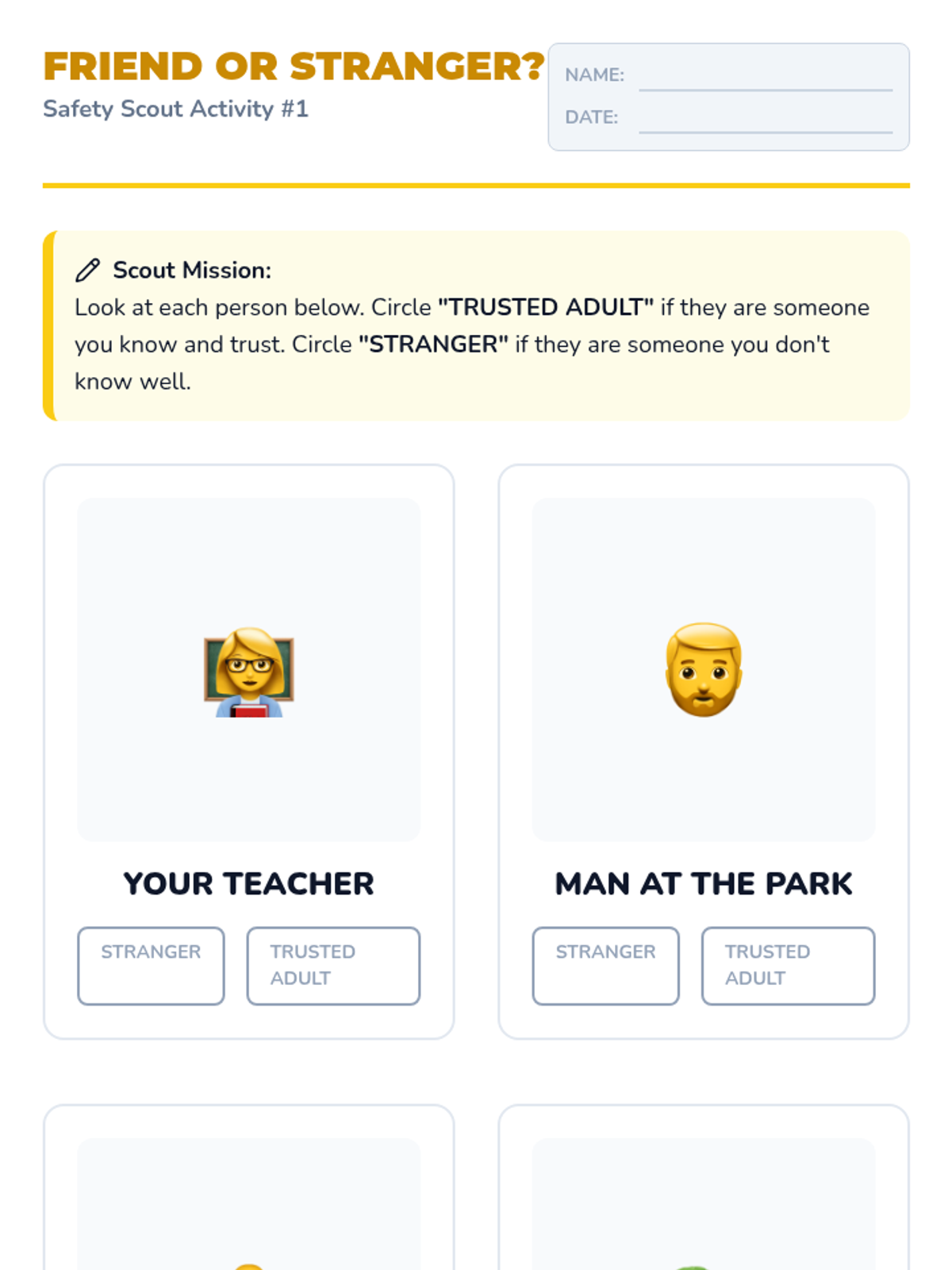 Stranger DangerDistinguishes between safe adults and strangers through situational awareness and boundary setting. Equips students with communication protocols and emergency response actions for public spaces.