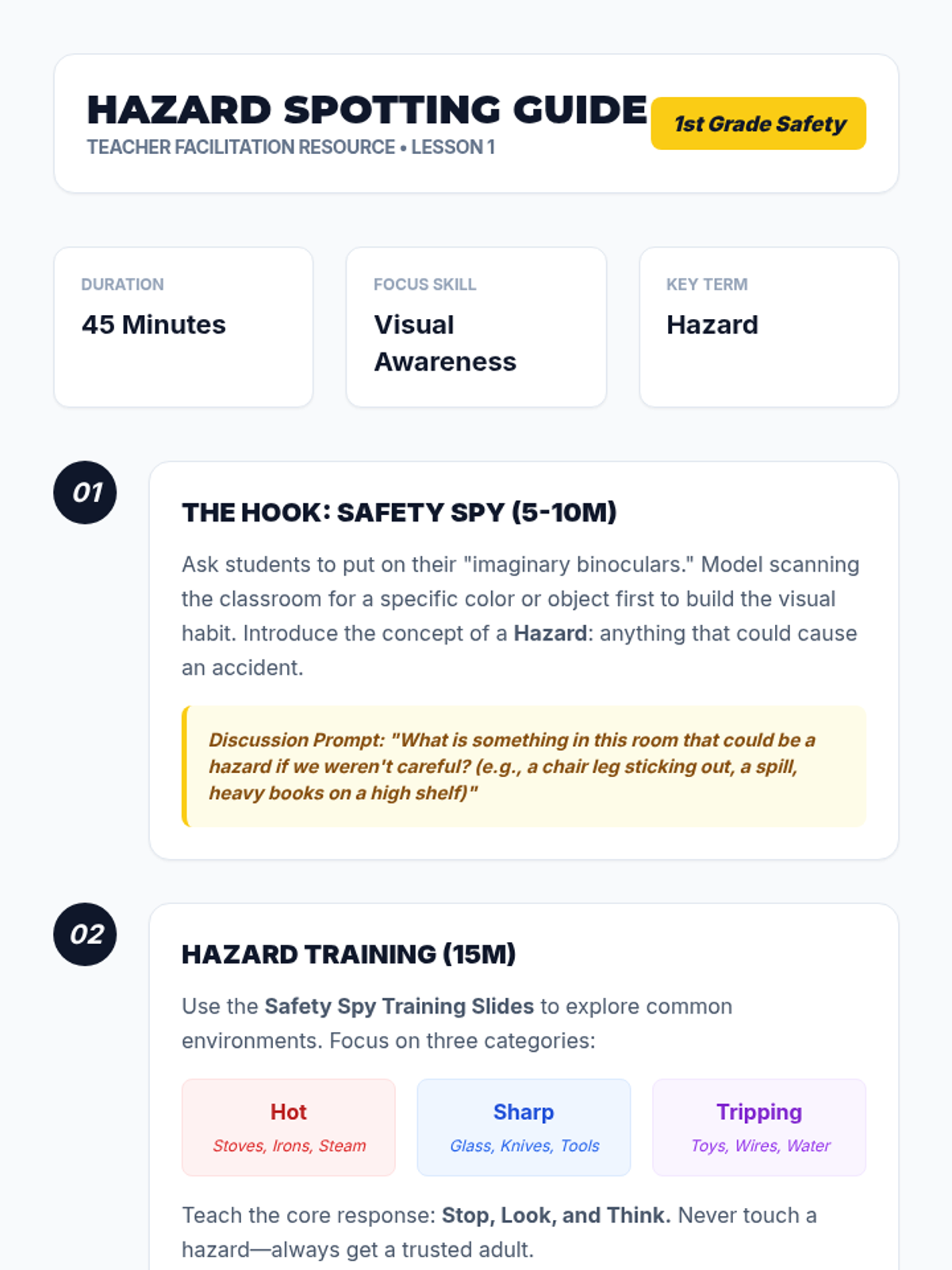 A comprehensive 1st-grade sequence on personal safety, teaching students to identify safe adults, recognize physical warning signs, and follow the 'Check First' and 'No, Go, Yell, Tell' protocols.