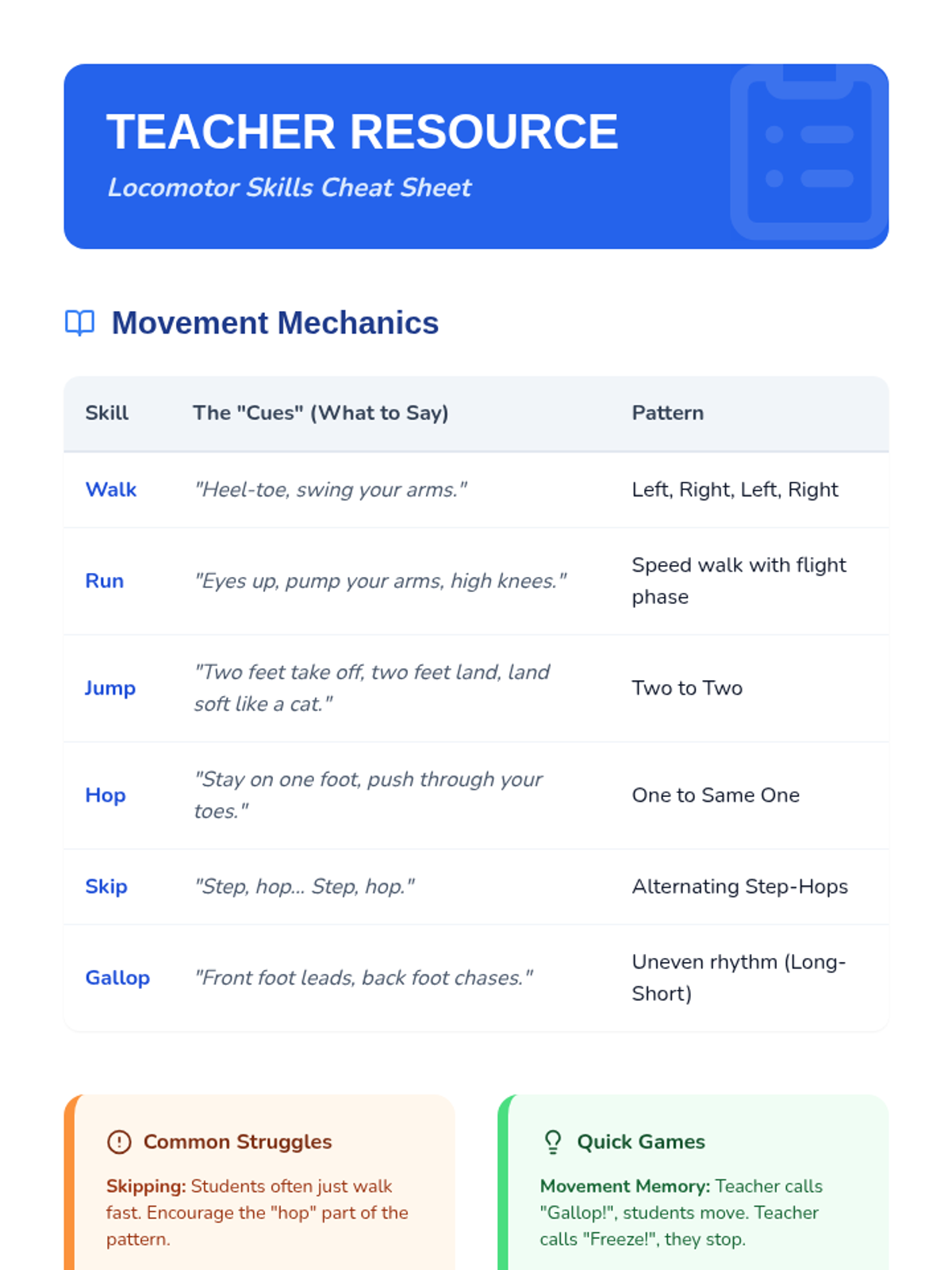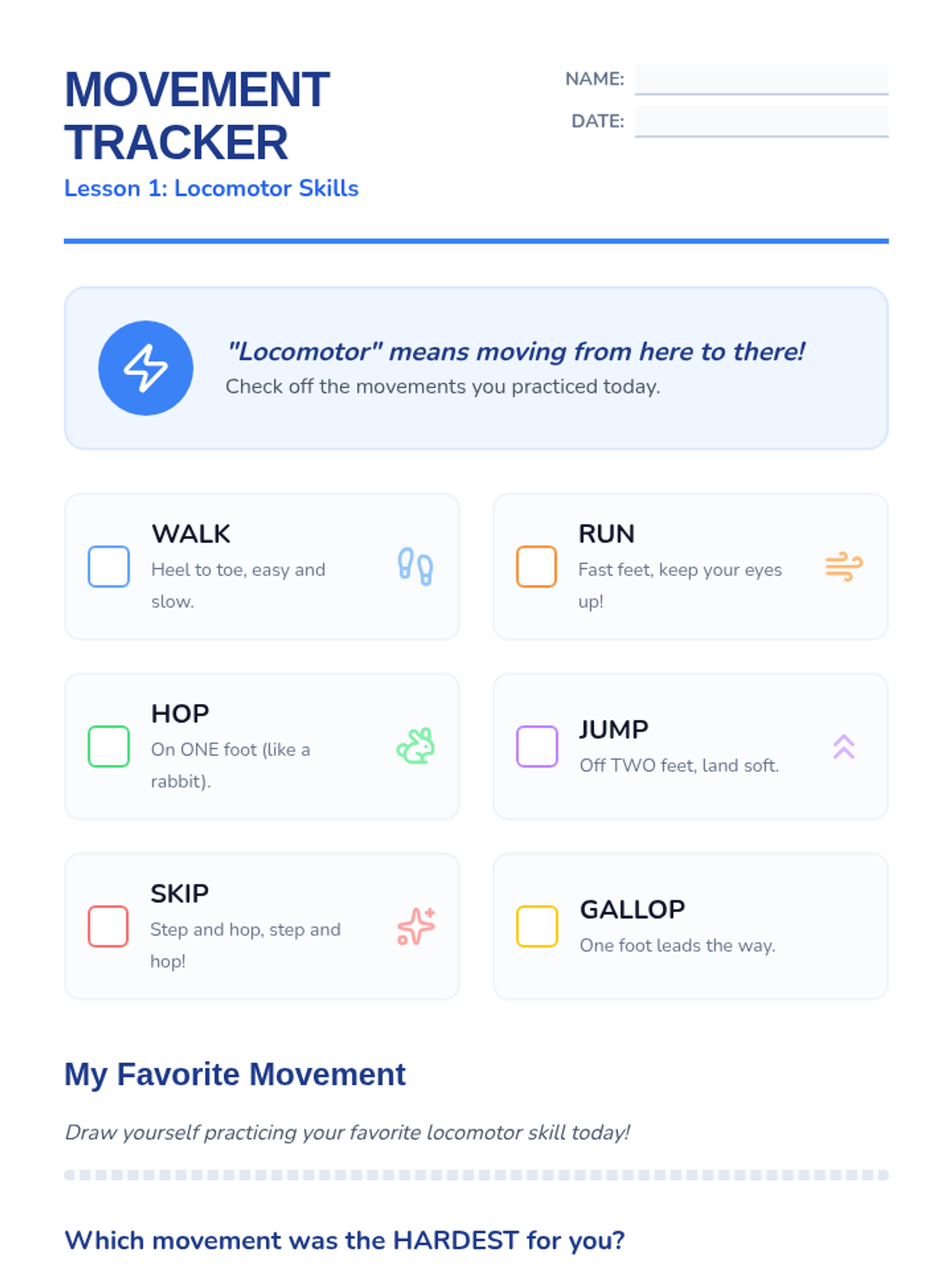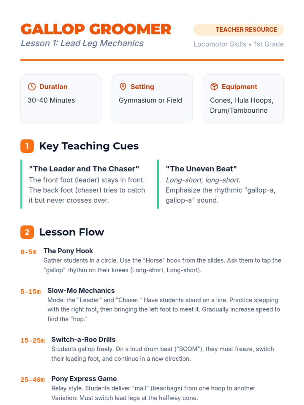 A 1st Grade PE sequence focusing on rhythmic locomotor skills like galloping, sliding, and skipping. Students explore the connection between auditory rhythms and complex physical coordination through games, music, and sequencing activities.