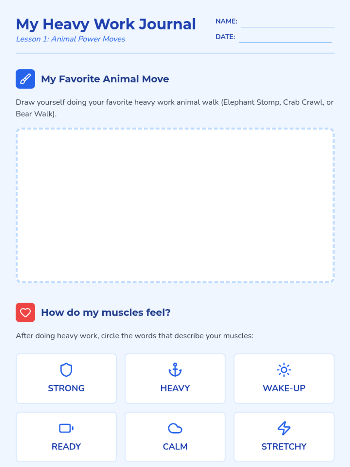 A game-based sequence for 1st graders to explore proprioceptive, vestibular, and bilateral movements. Students learn to use 'Animal Walks' and 'Superhero Moves' as tools for sensory regulation and cognitive readiness.