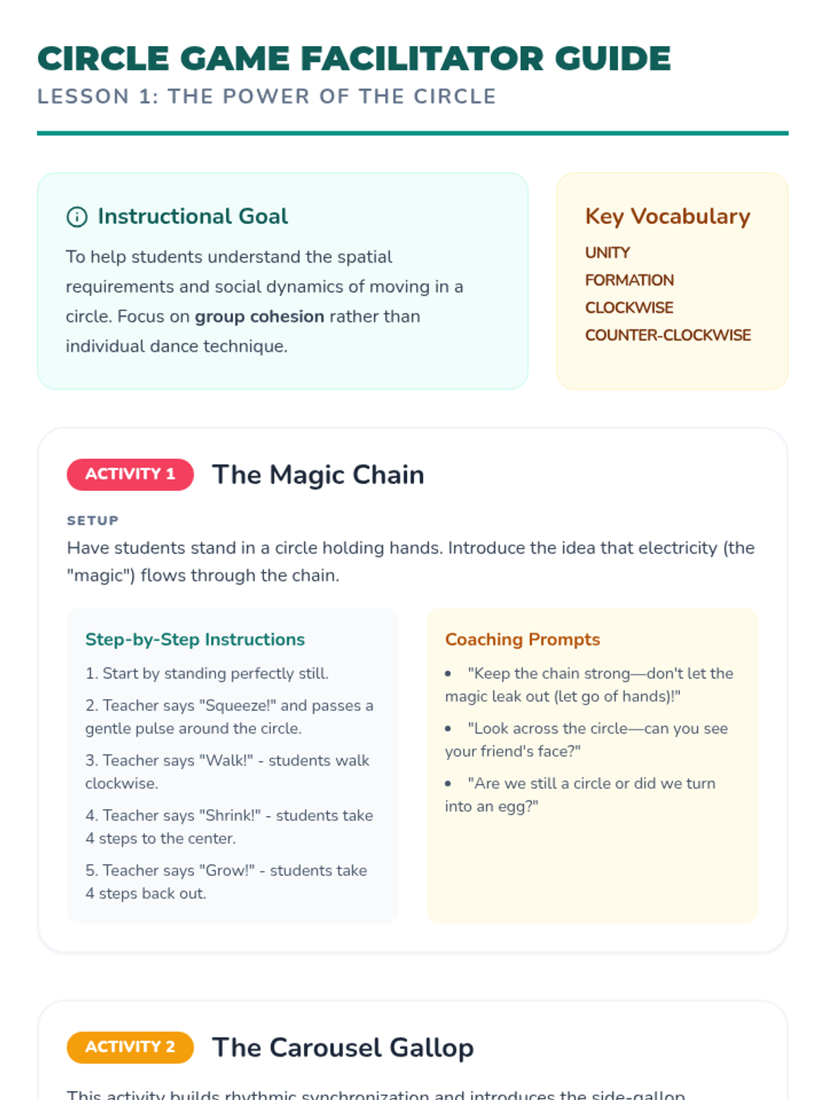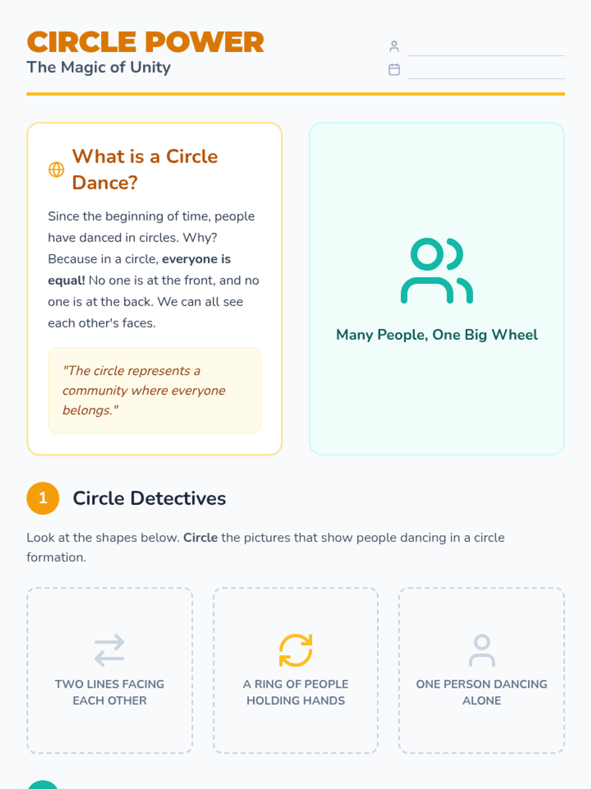 A 1st-grade dance sequence exploring the history and culture of communal dances. Students learn about circle and line formations, partner etiquette, and agricultural harvest dances to understand how movement brings communities together.