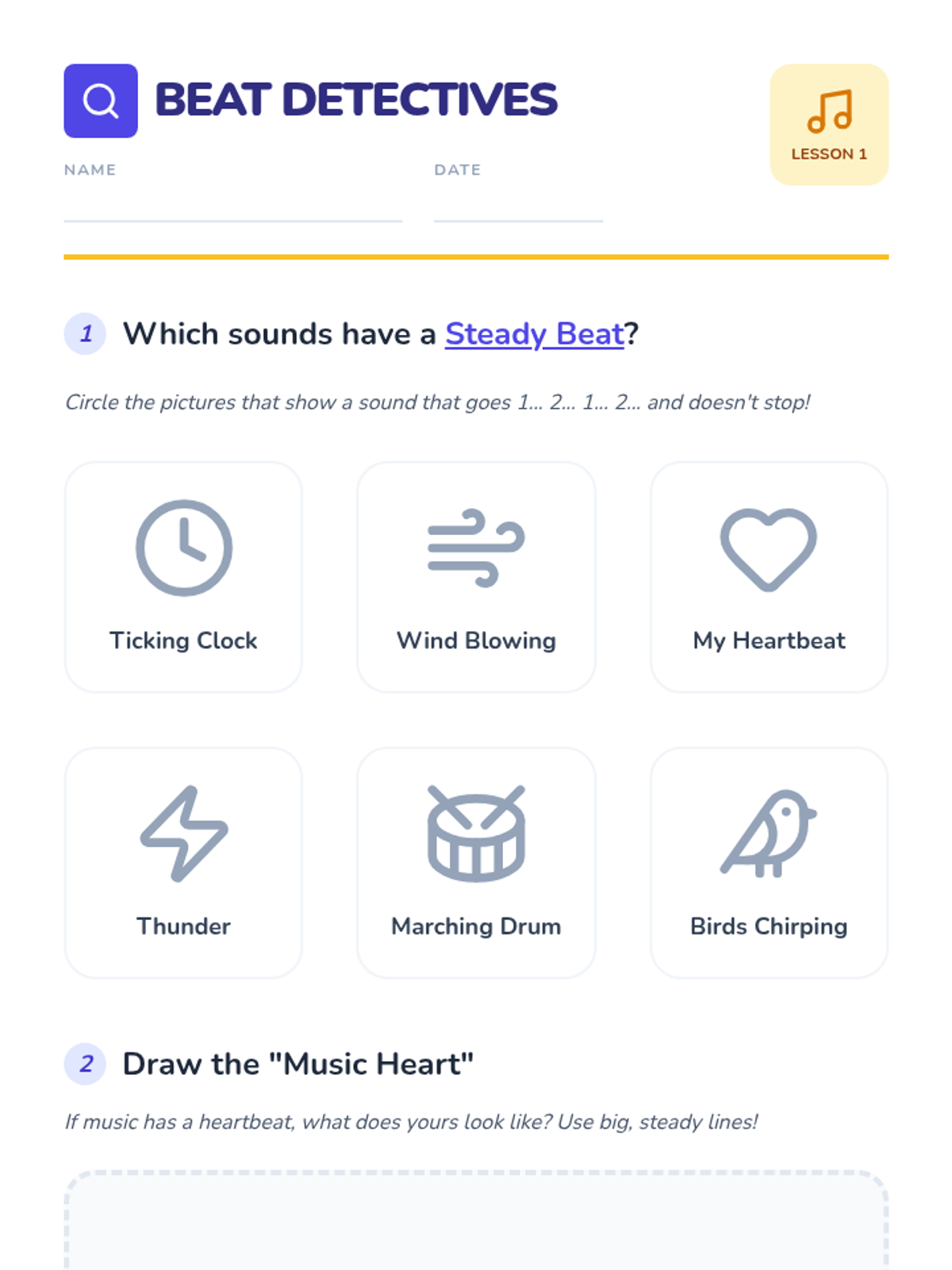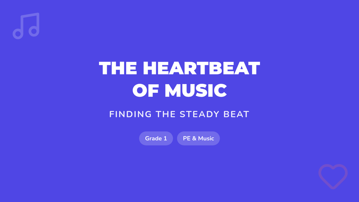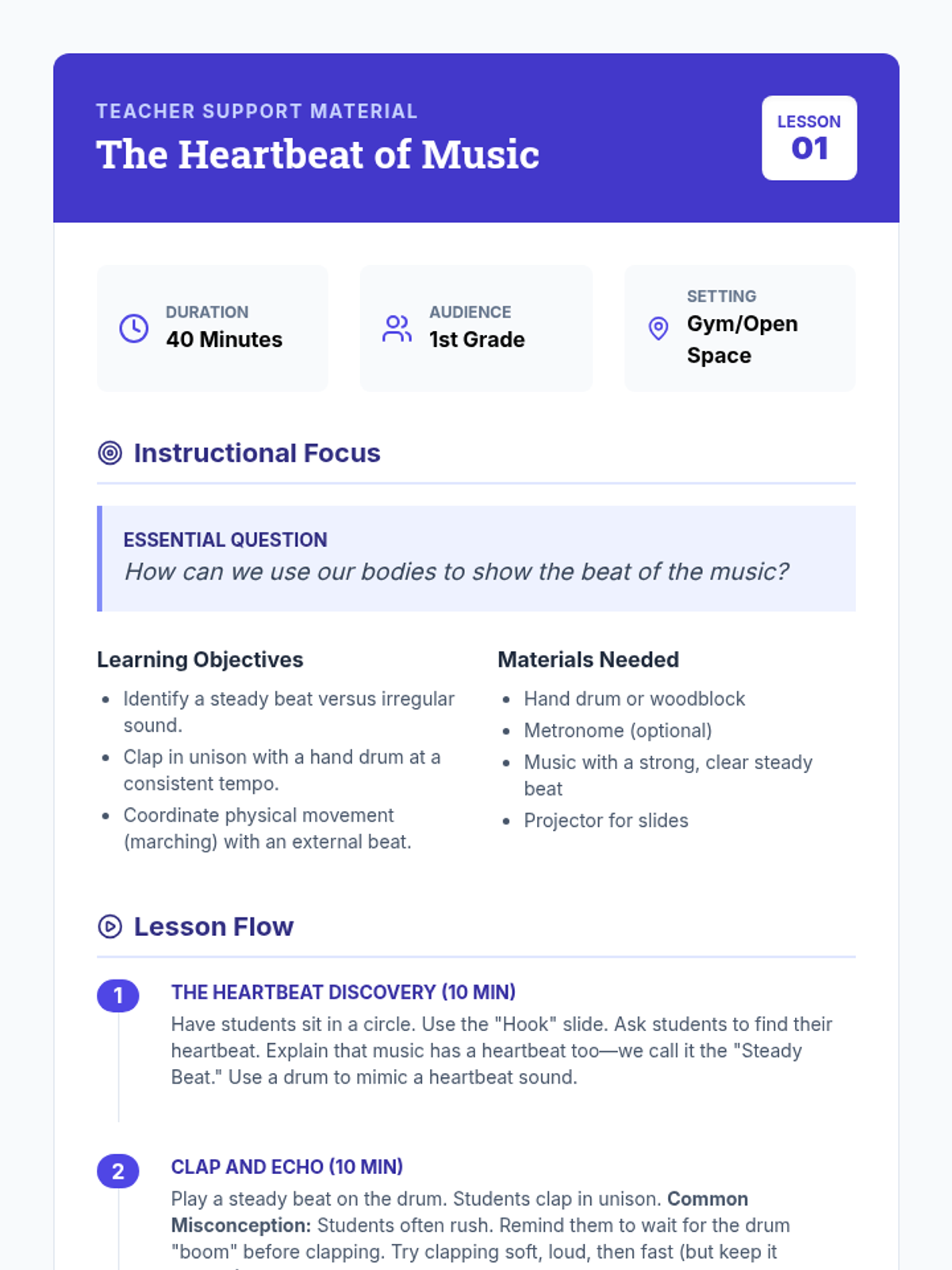 A 5-lesson unit for 1st Grade students focusing on identifying steady beats, responding to tempo changes, and synchronizing gross motor movements with auditory rhythms. Students progress from simple hand clapping to complex locomotor patterns and impulse control.